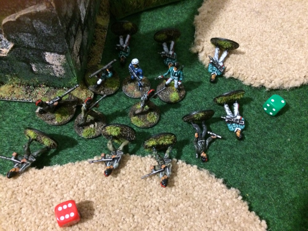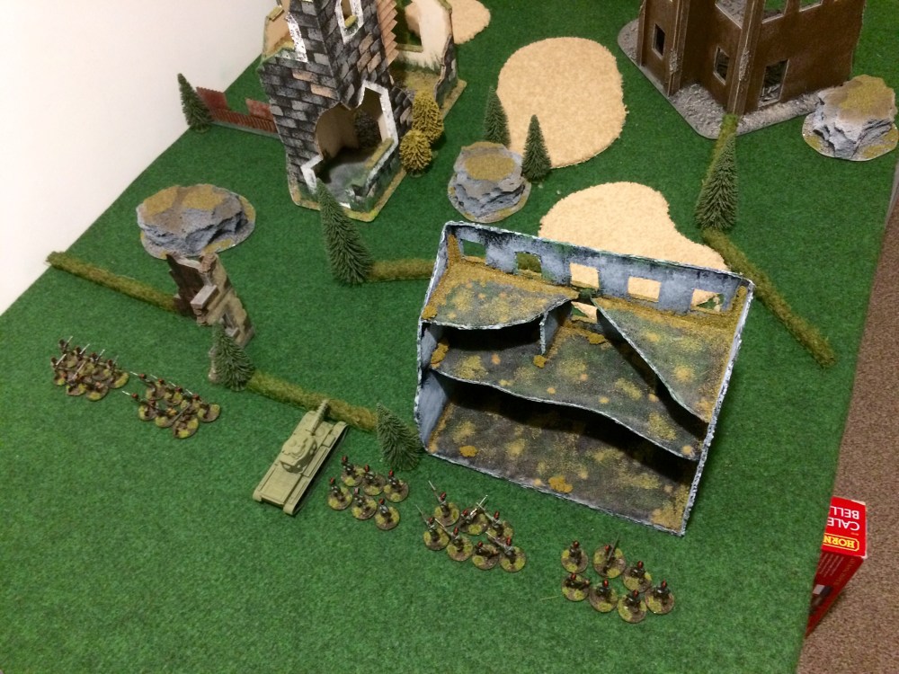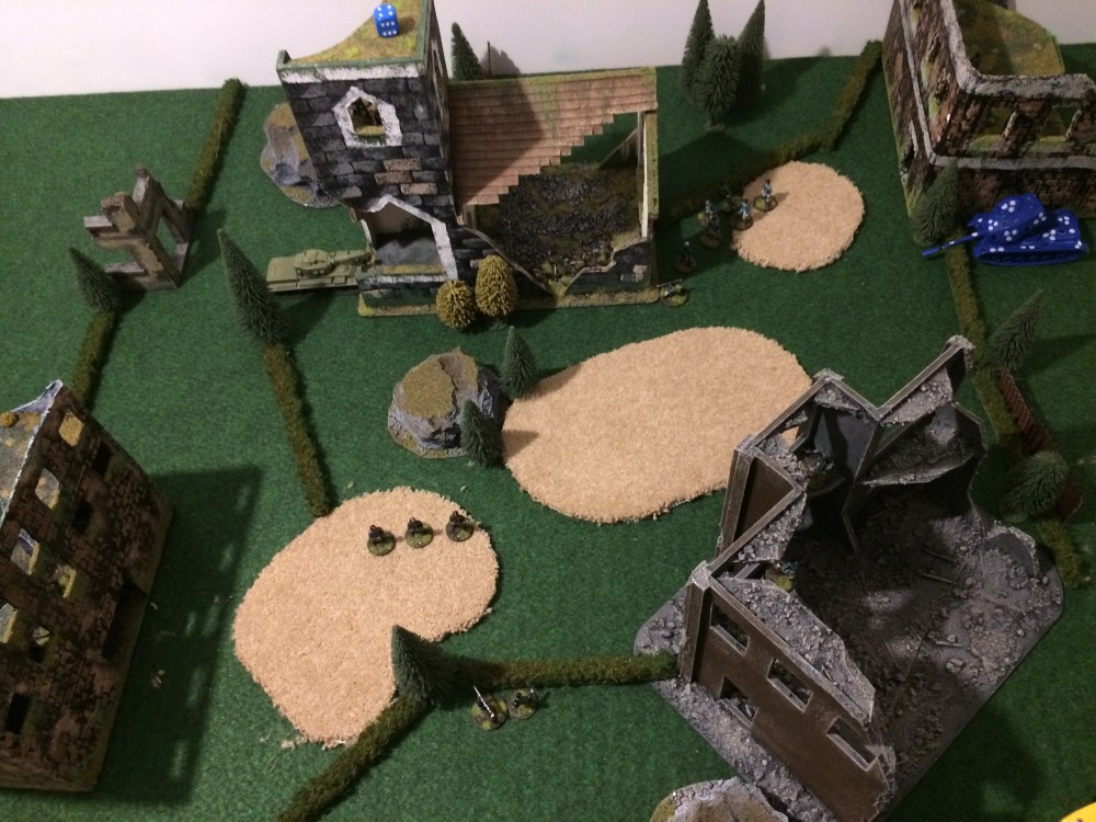 SolRad Deployment.House Baranor Deployment.The tanks shoot it out and House Baranor’s is immediately destroyed!Both sides advance under heavy fire. SolRad machine guns open fire from the building on the left, House Baranor’s from the building on the top right.