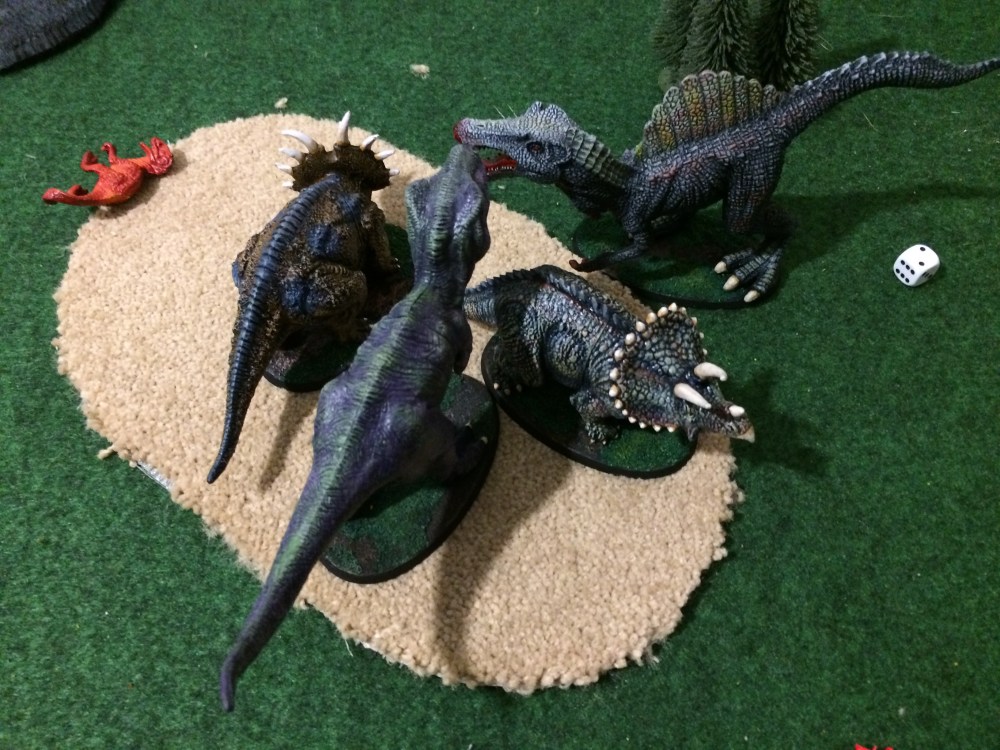 Below you can see deployment, T-Rex, Giganotosaurus, Utahraptor and Allosaurus, take on Stegosaurus, Spinosaurus, Triceratops and Styracosaurus. ‘Domination’ (board control) and ‘Destruction’ (wipe out half the opposing force) are our two overall objectives. ‘Call of the young’ is the unique objective for the mostly herbivores side, and ‘Escape’ is the unique objective for the carnivores, they need to get that Utahraptor off of the board. The twist this game is ‘Lavaflow’ at the end of each turn those red pawns (representing the lava) will advance D6″ across the board, any Dinos caught in the lava are immediately killed.