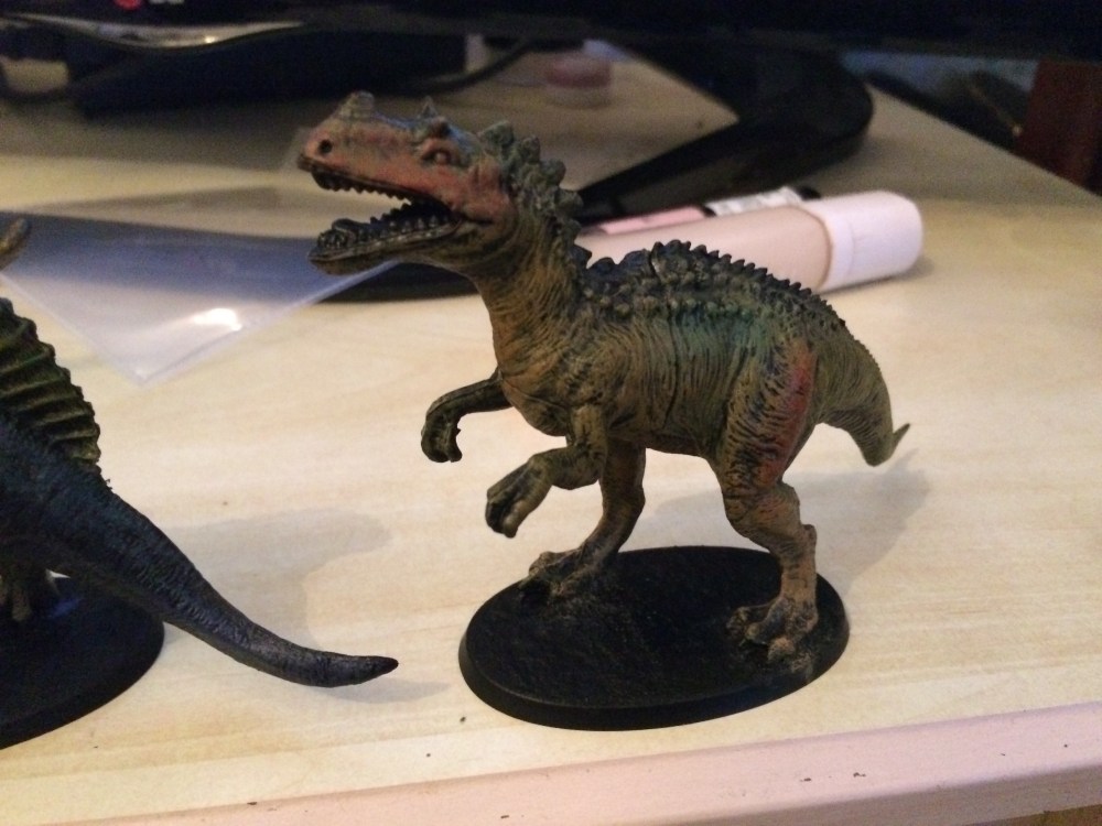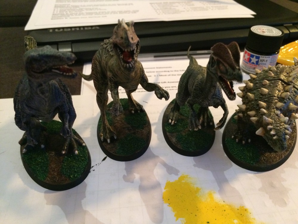 I use bases from Games-Workshop, they are a little pricey but fit well and I think boost the look of the finished product. To texture the bases you can use sand. However here I’ve used bicarbonate of soda and super glue. You simply spread super glue over the surface of the base and then sprinkle on bicarb. It adds a more realistic texture than sand, which to scale has particles that are too large, also it dries almost instantly, and since I have a decent amount of expendable income I prefer the slightly more expensive route to texture bases if it saves me lots of time, besides the dinosaurs are affixed to the bases with super glue anyway. I give everything a coat of black spray-paint and then get to work with my drybrush. The point of this initial drybrush is to put down the colours of the skin, I mix colours, use reference photos from google images, but generally just try to have fun. Here’s what you’re left with: