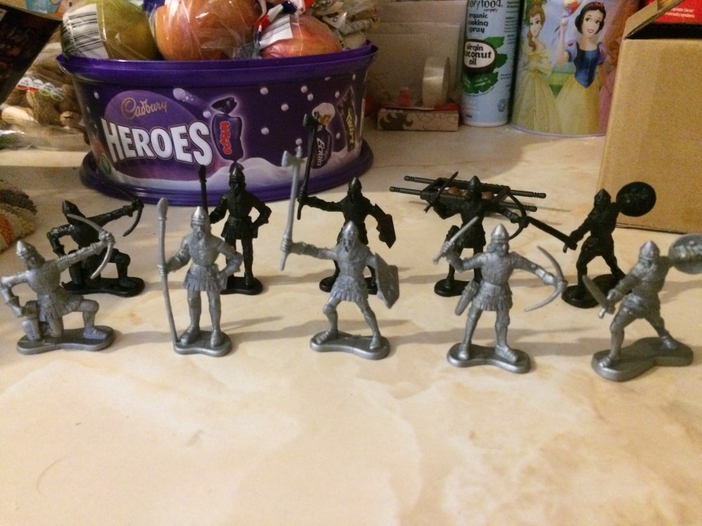 I remembered while reading H.G. Well’s Little Wars that he struggled to come up with quick and easy rules for simulating musketry, I thought if you go back before muskets, and have say knights fighting each other with ballistas and catapults or trebuchets instead of cannons, problem solved eh? Well, no… for some reason I overlooked bows… alas the Amazon order was already in and a little while later all this stuff arrived.