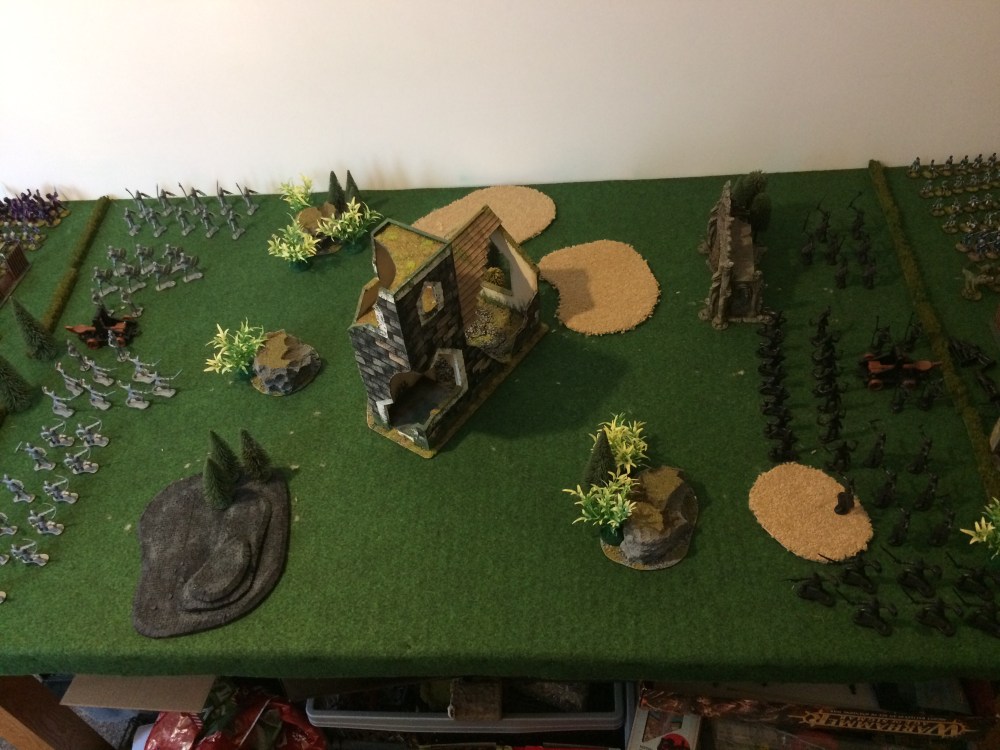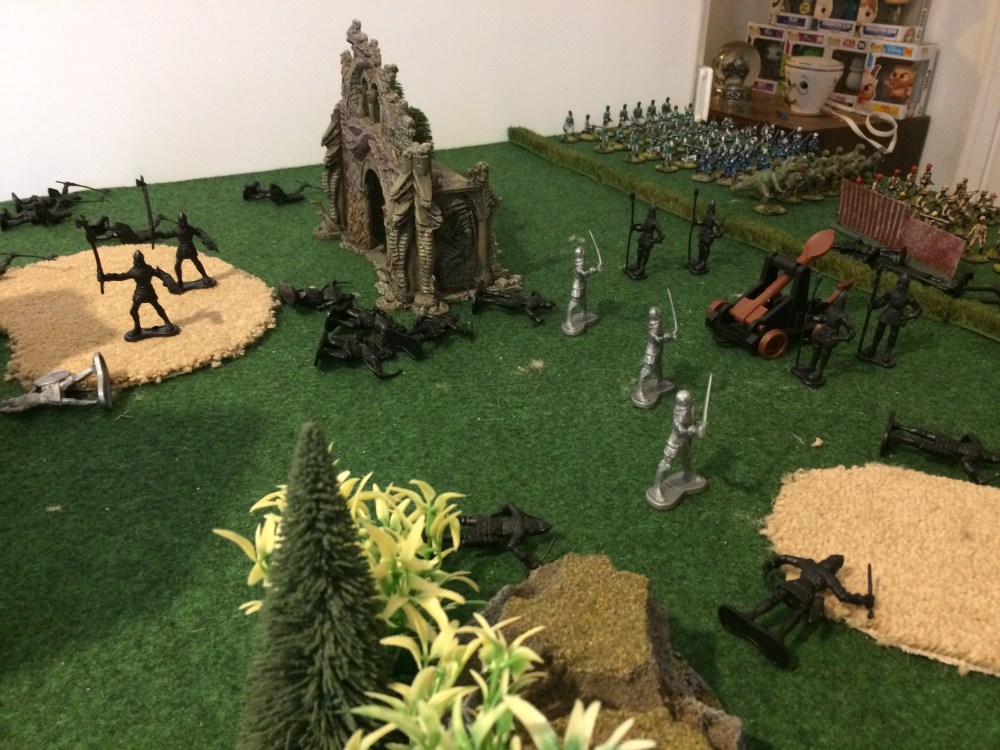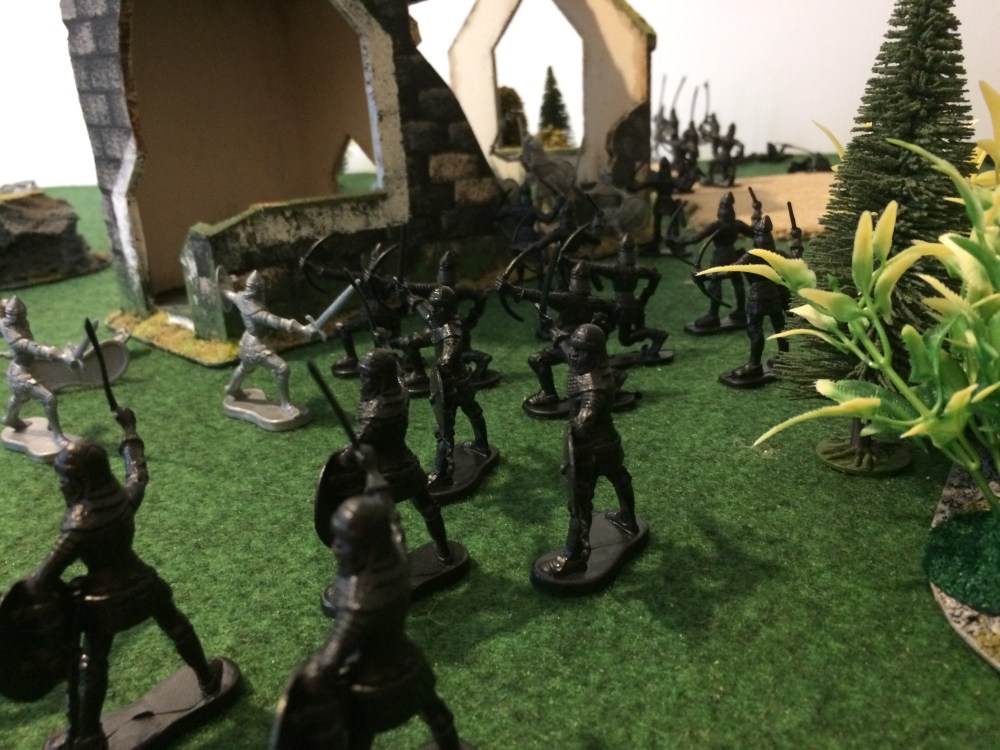 I excitedly set up a table and got playing. I decided to win one side would have to knock out the other side’s trebuchet by killing all four of its crew. Each figure moves 9″. For combat rather than using H.G. Well’s rules I went for a simple roll off between combatants, high roller wins, when a draw is rolled both combatants die. Regular infantry fighting archers would get a +1 to their die roll. Archers could also fire their bows, and would kill their nearest enemy on a roll of a 6.