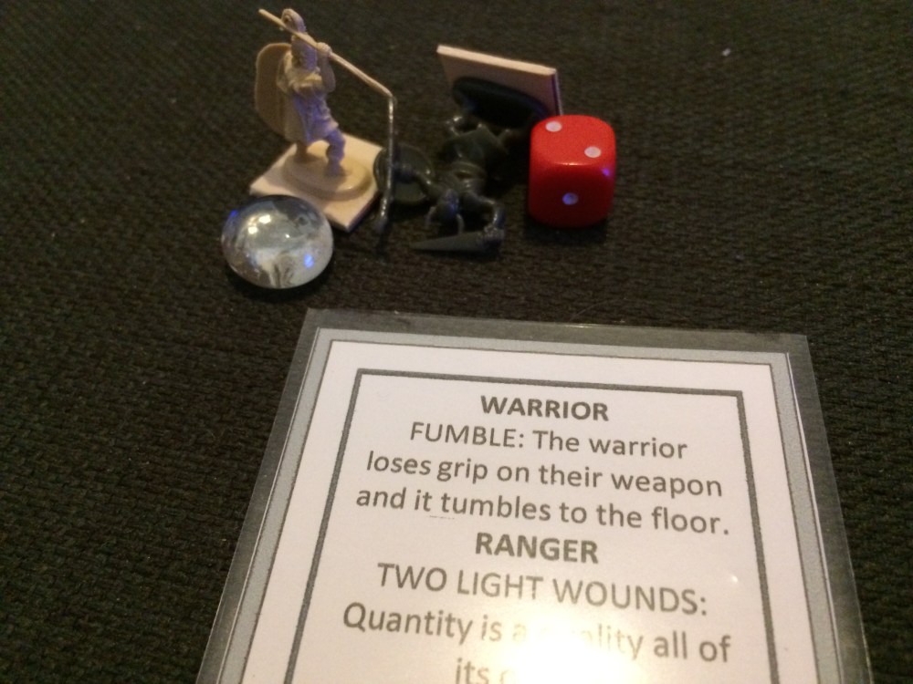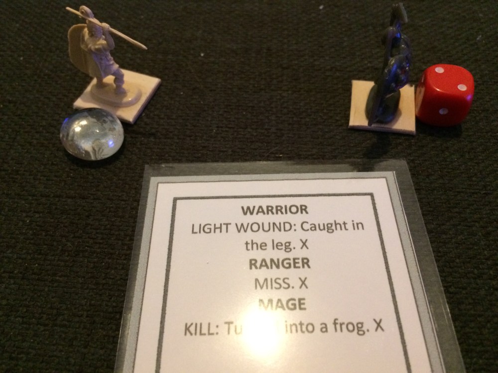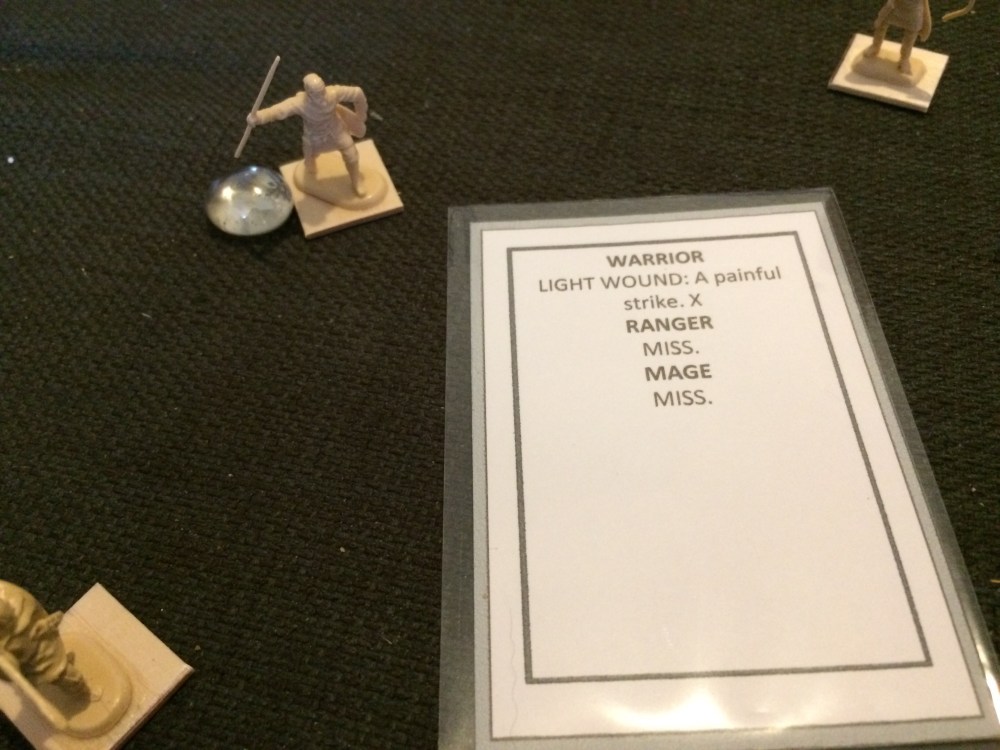 Later in the game the other warrior got his opportunity to strike, on the right his attack card was a ‘Light Wound’, enough to finish his target off. His opponent flipped a card over to see if he could save himself, unfortunately since the description for warrior on the card didn’t end in an ‘X’, it’s a failed save and the warrior is slain.
