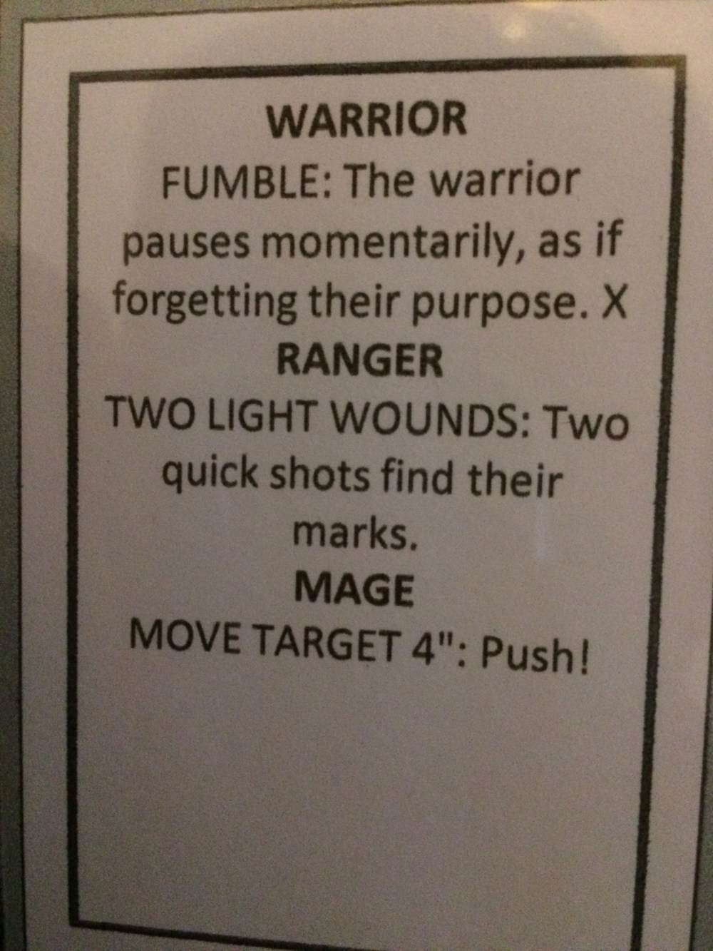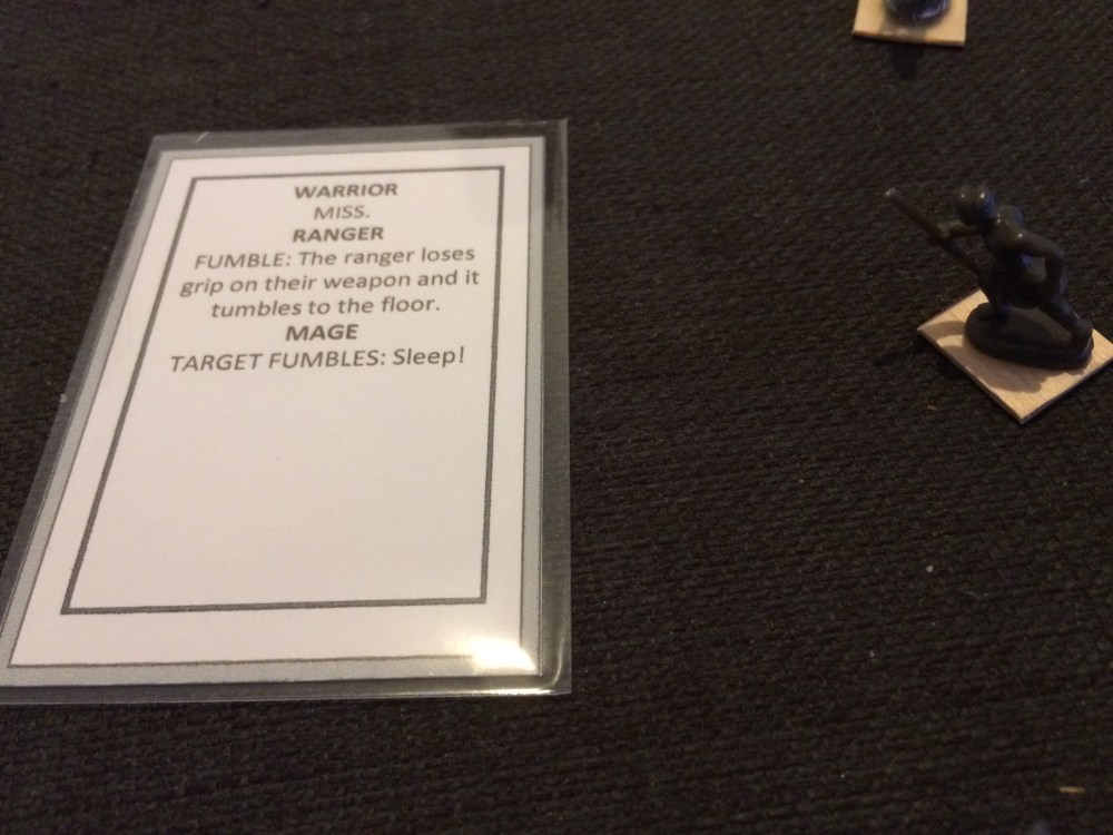 If a warrior flipped this they would fumble, but if they flip it for a save they would be successful. A ranger can cause two light wounds, either on the same target, or splitting them between two separate targets, but would not successfully save against an attack, a mage won’t save either but can use their magical abilities to move any character in play 4″.