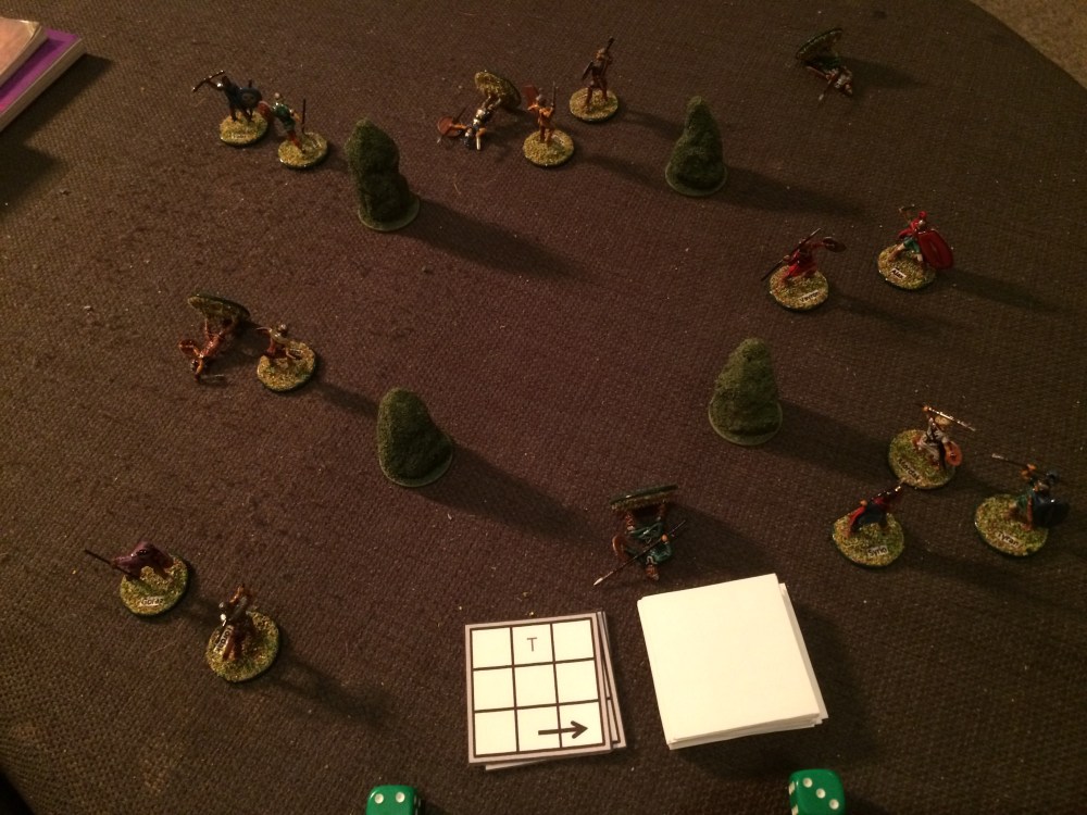 So I take four of the ‘trees’ (tin foil glued to washers and flocked) put them in a square to create a rough representation of a 3×3 grid. I then flip over the top card of the deck, the card shows an arrow moving from one grid square to another. First the figures in the grid square the arrow starts in fight, then the survivor/s move from that square to the square the arrow points to, and they fight again, then a new card is flipped. Fights are easily resolved, although I’m on the hunt for a better mechanic, but for now, I roll a die for each figure and the lowest roller is eliminated.