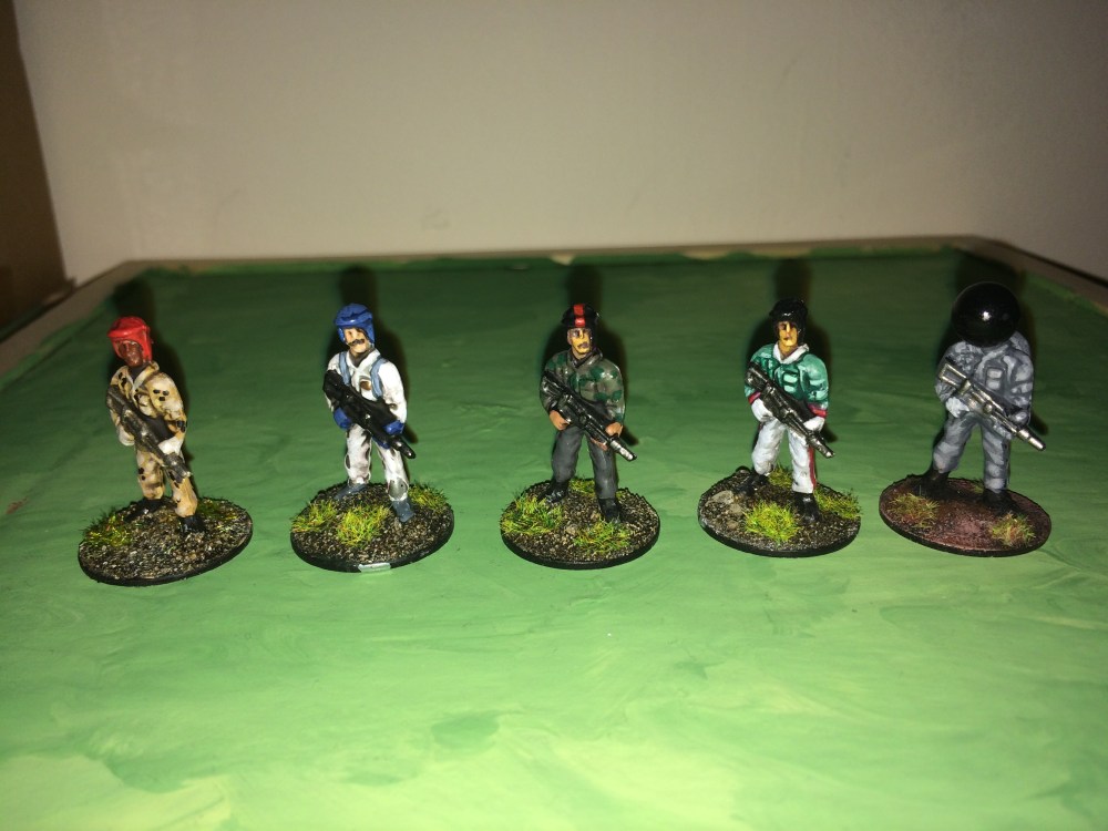 Not the best, again using flash (we haven’t quite worked out the lighting in our new place yet). From left to right we have a Jendari Tiger, a Gnossian Commando, a Solar Raider, a soldier of House Baranor and a Jendari Ranger. I love these figures, I love their versatility and I love their simplicity in design which can really speed up painting.