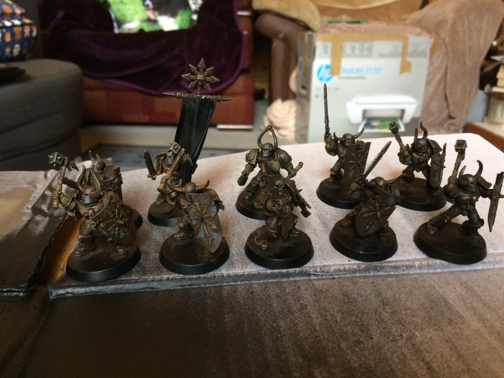 So I’ve started painting with a unit of chaos warriors. I’m so happy with how they’re coming out, I’m going for a rusty, grimy look with the chipped and peeling remnants of their armour’s paint on flatter surfaces or in deep crevices.