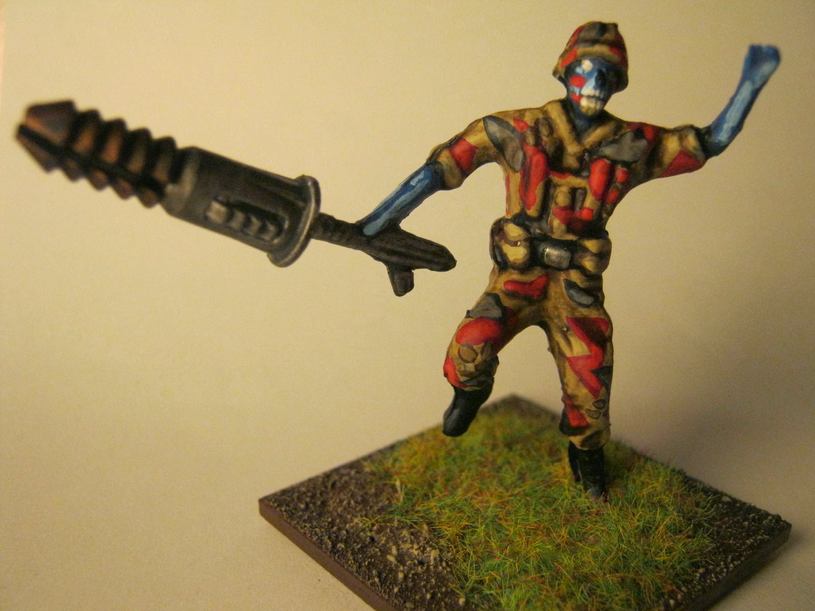 The Khef above is also a reanimated corpse, he has mismatched trousers, possibly from a Korban unit, and his helmet is a much older style of camouflage. The weapon he is carrying is known as a Molecular Shredder or Molsh for short. The Molsh literally does what its name suggests and is not hindered by any current shield technology. The disadvantage of the Molsh is its unreliability and shortened range. If hit by this horrific weapon, the target, if it is a biological one, is often reduced to a red or pinkish slime. This slime is also referred to as Molsh. Military reports instead of recording a person as deceased when killed by a Molsh will say ‘Molshed’, this is primarily so the family can prepare themselves for what may be shipped home.