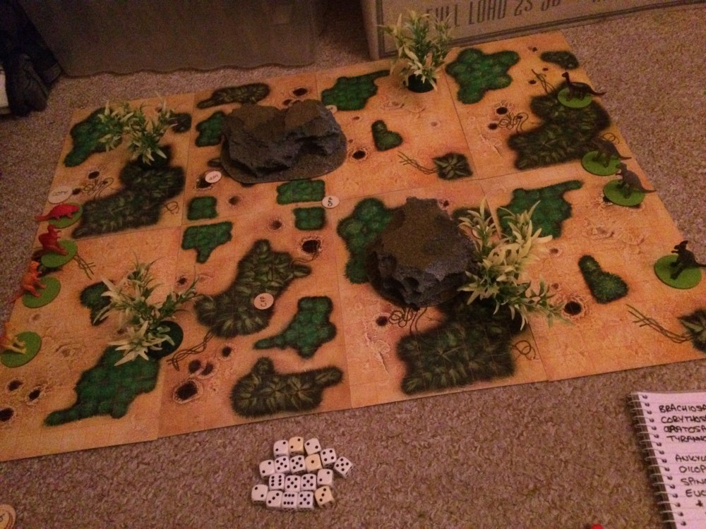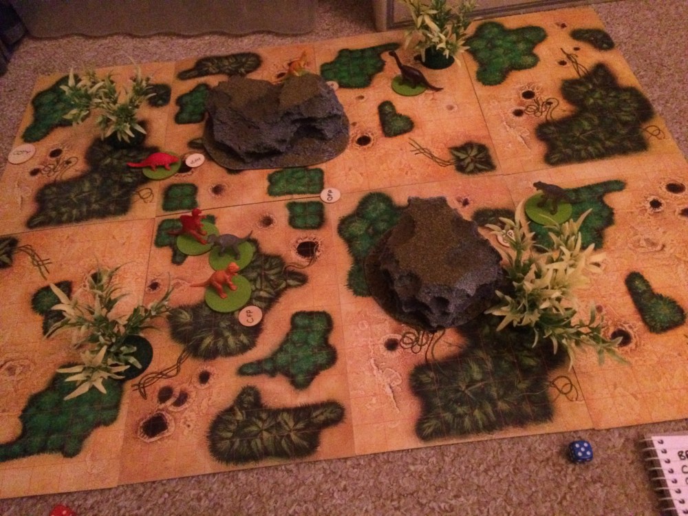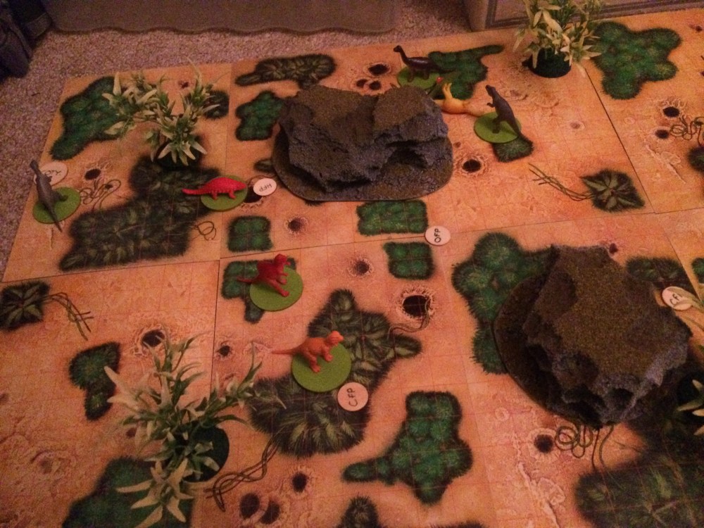 However, Ceratosaurus broke from the combat and made a speedy escape scoring an objective (far left) as Brachiosaurus and T-Rex finished off Eucnemesaurus (top middle).