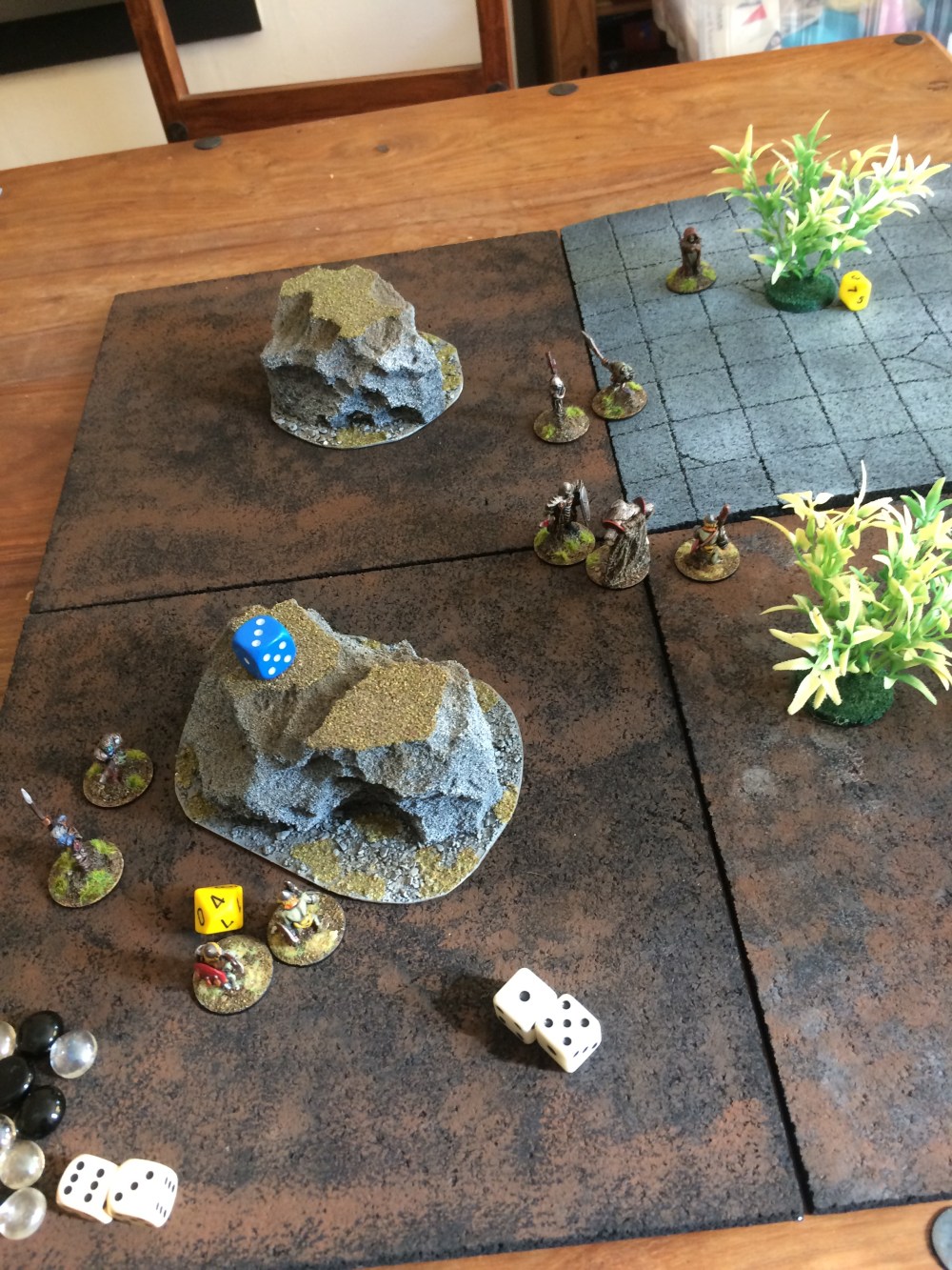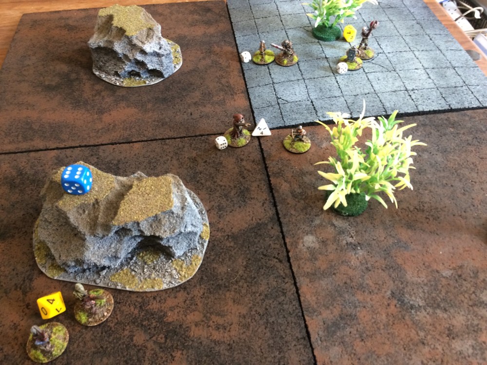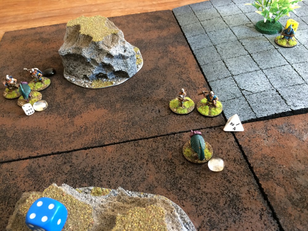 I played a simple scenario for my games, there are three objectives the two D10s and the D4 in the centre. At the end of six turns if neither side has routed the side with the most figures within 3″ of an objective scores that objective, the side that scores the most objectives wins. The big blue die keeps track of turns. Here the Orcs were doing fairly well despite their Shaman being toasted early on. The Orcs were given high attack stats but low defence stats as I wanted to see if they could get in and cause enough damage before they get slaughtered, turns out that wasn’t on the cards. There currently are no buffs when you charge into an enemy and attack them, I thought simply having the opportunity to attack first would be enough. Plus in reality people don’t fight in turns. You can assume that both fighters would be charging at each other so a charge buff makes little to no sense. Having said that it would be nice to have that sweeping charge feel to certain actions, and it adds more strategic strength to traits involving speed and means you have to be more concerned with where your figures are positioned, so although in my head I can see how a charge buff in a skirmish game is kind of dumb, it does raise the level of strategy required to be successful in the game… so it’s also a smart move… I’m torn!