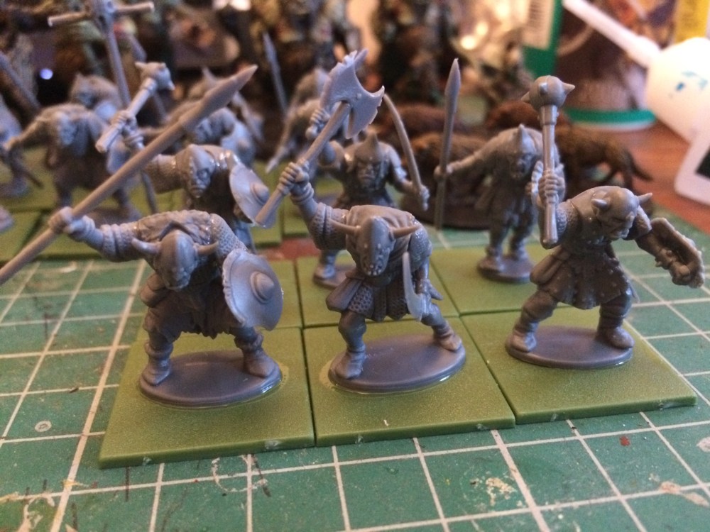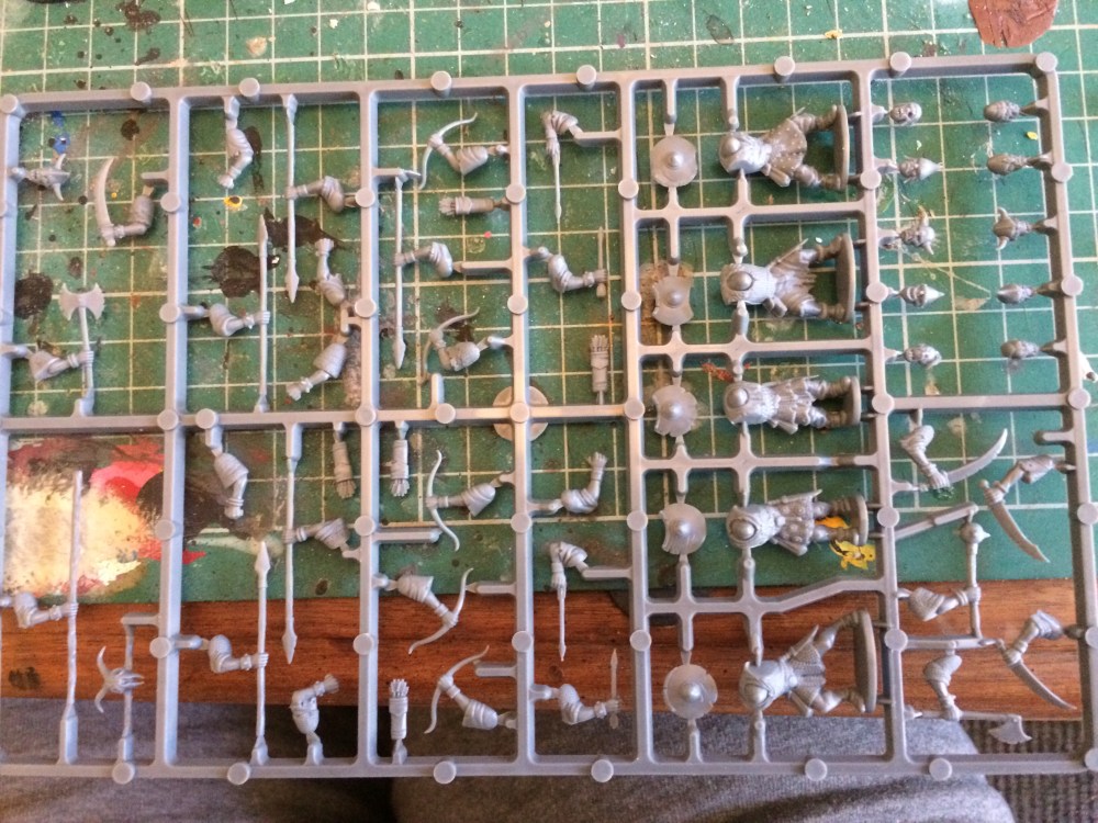 In the box you get 6 of the sprue above which contains 5 bodies, 11 head options and enough gear to equip each of your guys with a spear and shield, smaller hand weapon and shield or with a bow. Out of the box I put together the following (ignore the other projects):