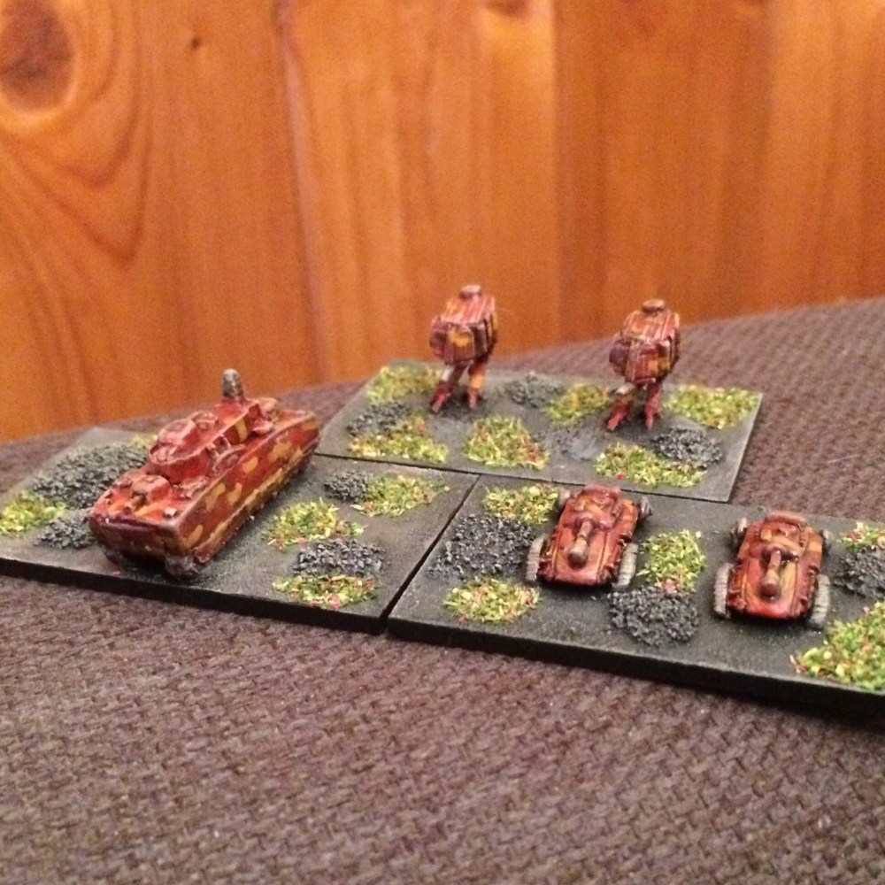 As with the previous army I based them up for Hell On The Margin on 5cm by 3cm bases, each base supposedly representing a company but models wise actually appearing as an under strength platoon. Above is a large tank/ battleship thing, two AT-ST style walkers and two tanks. Here’s a side view: