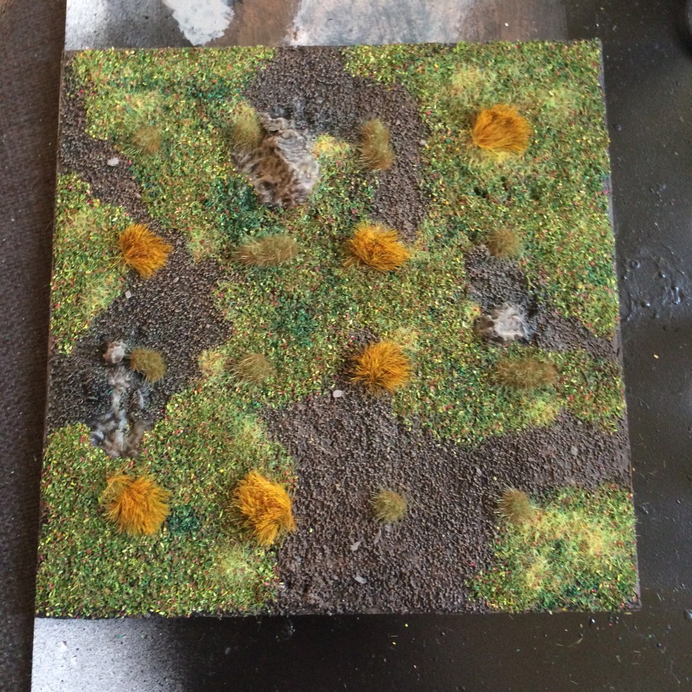 I skipped ahead a bit here because I got excited, but once I’ve covered it in sand and painted it I put down flock and tufts. The tufts are key here, because what you might not have noticed is they turn the board into 5×5 grid. The grid is so I can avoid fiddly measuring.