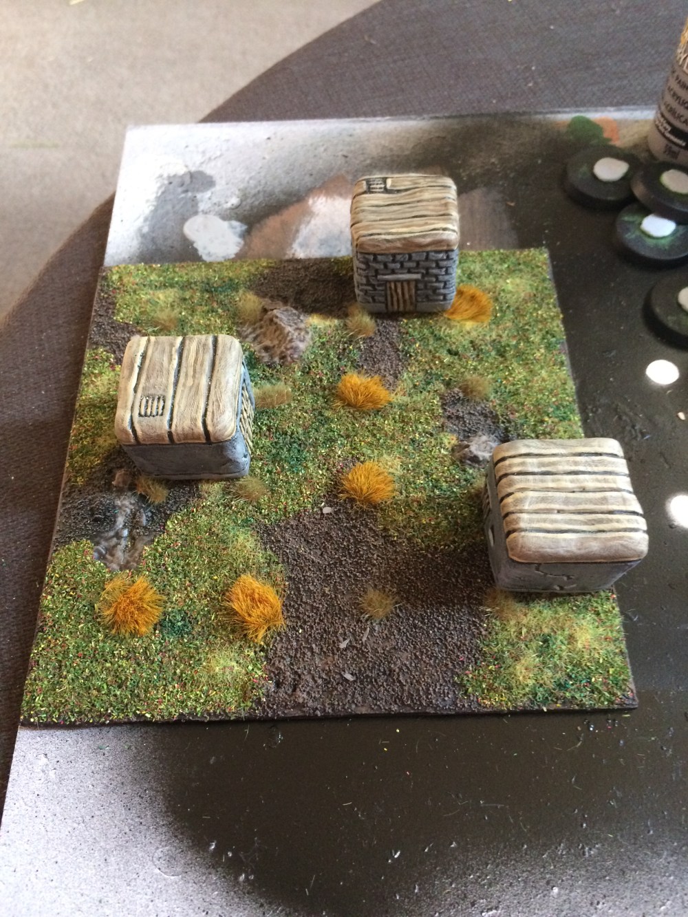 I’ve also had these small buildings knocking around for a while. They’re simply made by smearing Milliput over wooden blocks and then drawing in the texture with an old biro pen. They just so happened to fit the grid perfectly.