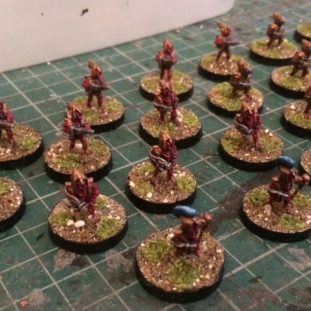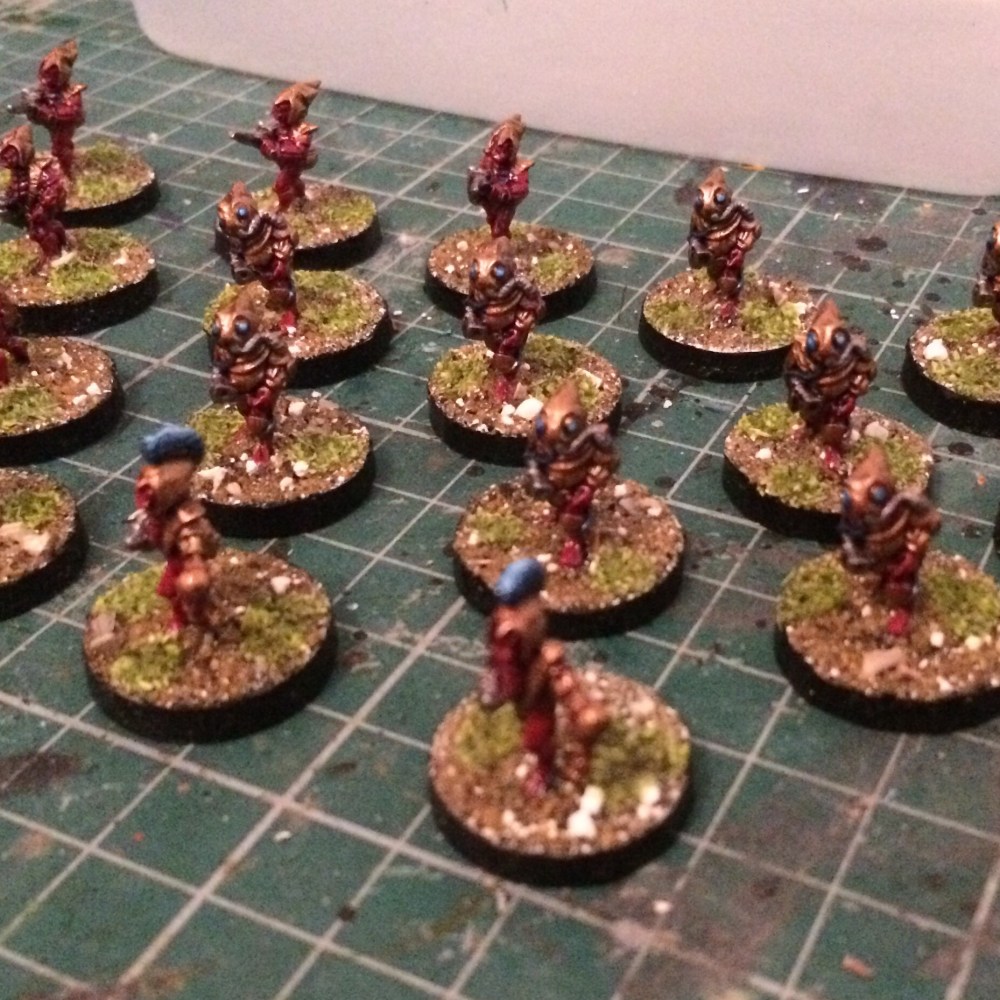 I then added patches of flock. I’m considering making a mix of my sand/litter and flock like the base ready stuff available from Geek Gaming. It’ll be interesting to see if that works. Getting basing done in two easy steps without compromising quality is certainly something I’m up for!