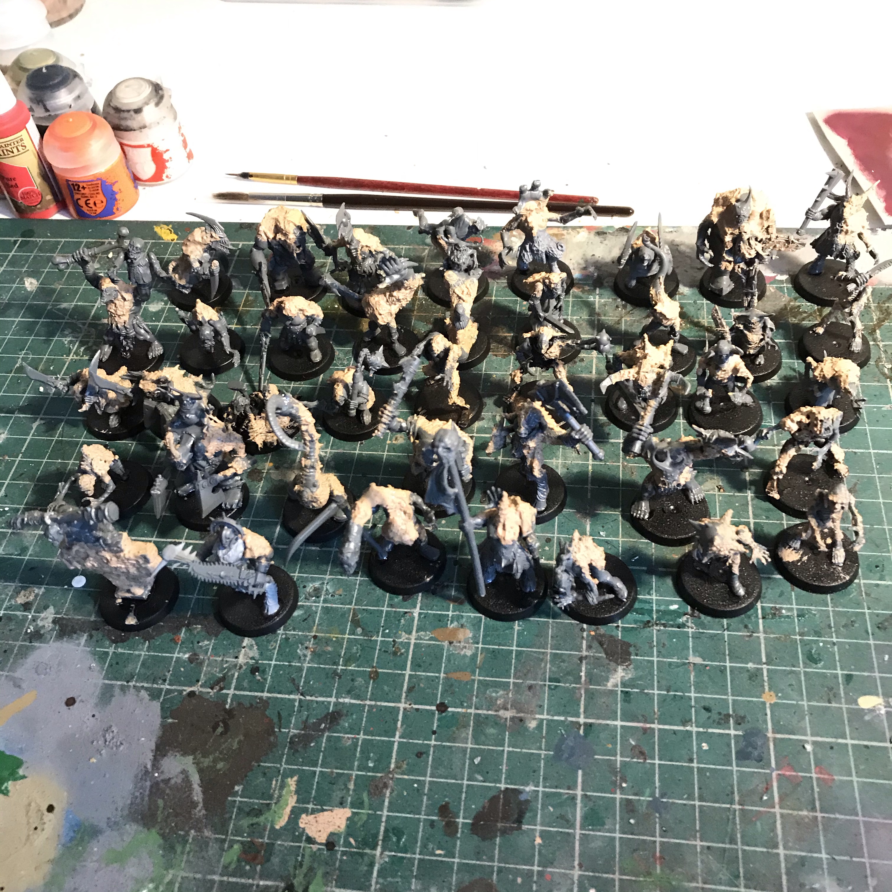 Below you can see my efforts before priming. They’re a mish-mash of parts but have all the Pox Walker essentials: claws or a hand weapon and they’re on a 25mm base. The sandy coloured stuff is a texture paste I make from sand, pva, filler, no more nails and paint. It’s there to strengthen weak joints add texture and interest to flat areas, and fill gaps.