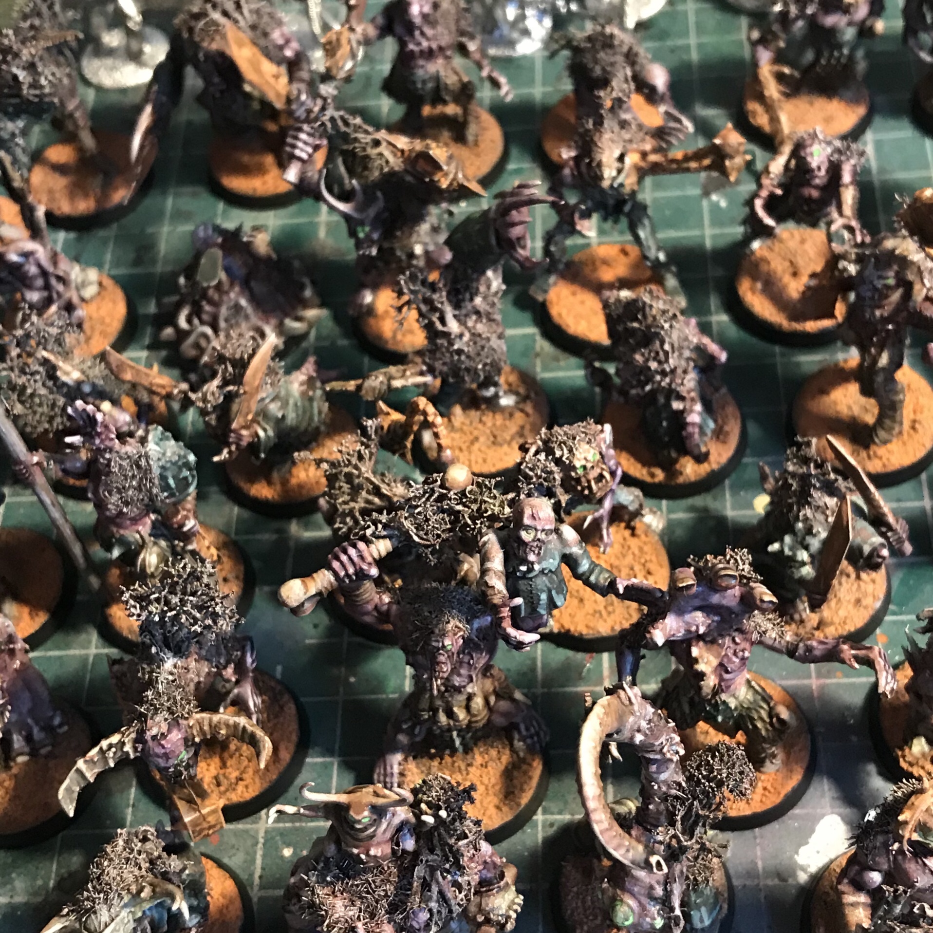 Because of the watercolours you have to spray varnish the figures or sweaty hands might remove your paint job, also it means you can play 40k in the bath. All in all I’m extremely happy with how my guys have come out and even while writing this I’m working my way through applying watered down PVA to the lichen to add much needed strength (I don’t know why I didn’t do this before). I might even apply some neat PVA to the ends of the branches and put them into some flock so they have leaves on their trees as if they’ve just emerged from Nurgle’s garden. I wanted to create a sense of a wall of horrible things coming towards you, and I think I’ve achieved that!