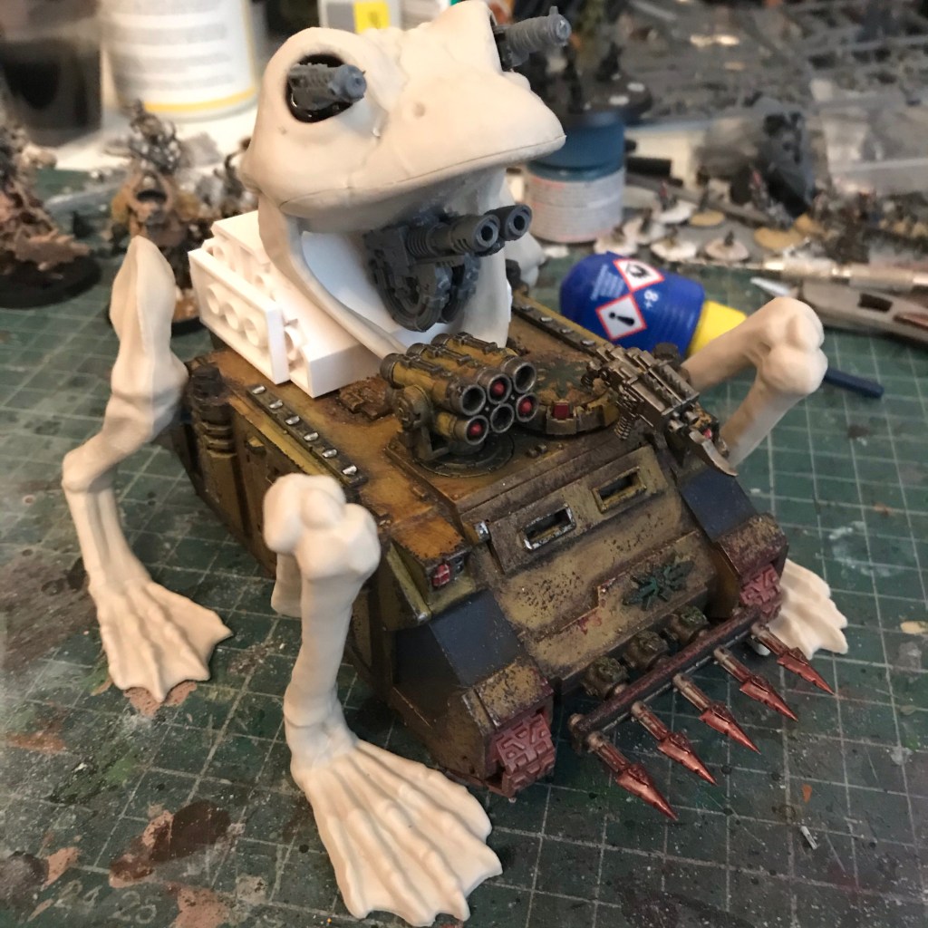 I went through several iterations of combining the frog with the tank and landed on what you can see below. The frog was surprisingly hard to disassemble being held together with screws of all things! I was expecting flimsy glue. But I got there in the end, and combined with a useful bit of lego, you should always have random bits of lego on hand, I managed to get the shape I was after.