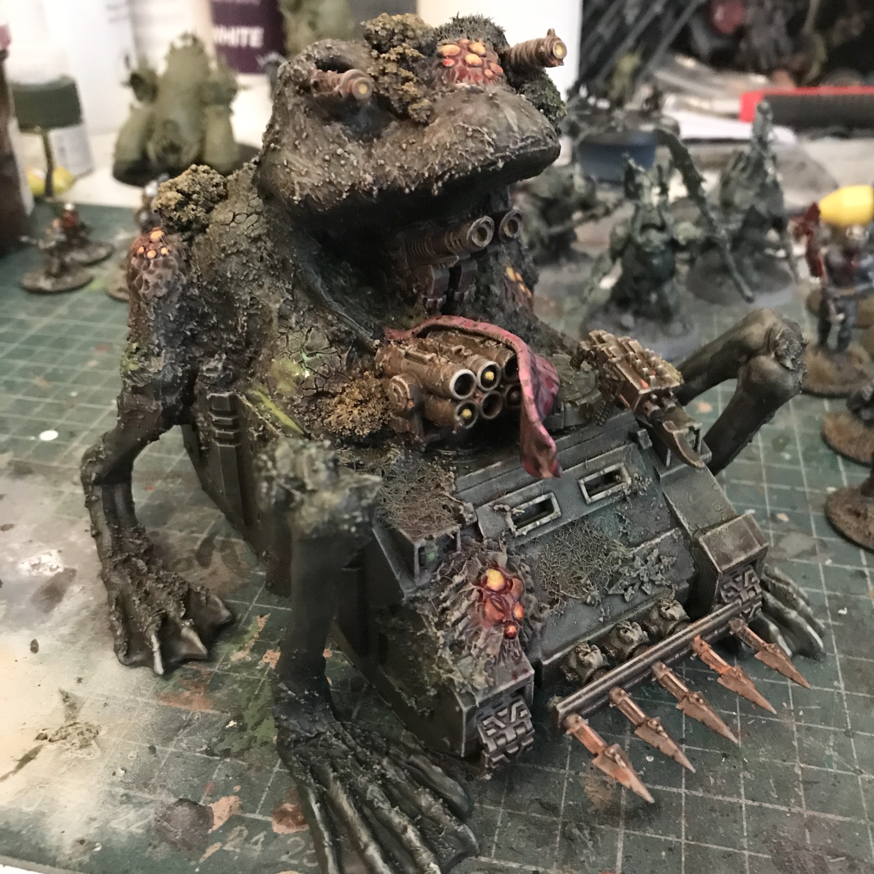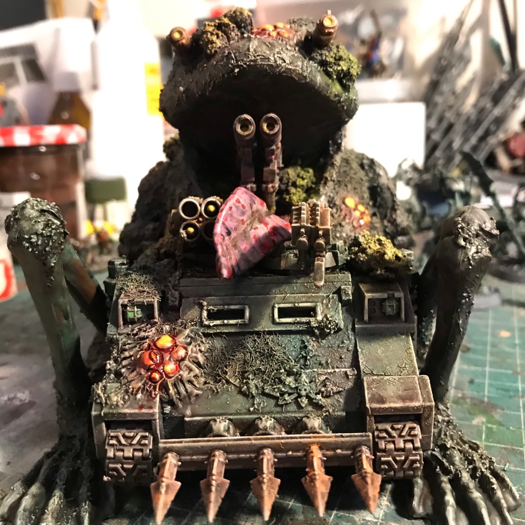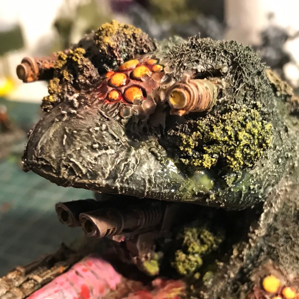 I built up behind the head with tin foil and covered over it with a little paper mache, and once dry I threw on all the textures I had to hand. I sculpted some stuff with Milliput, used my own texture mix, added static grass in patches, and applied Citadel’s Agrellan Earth in places to get big cracks in the skin.