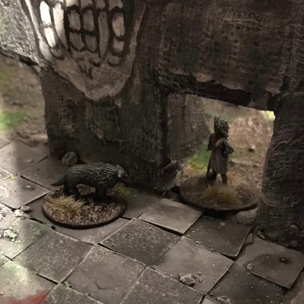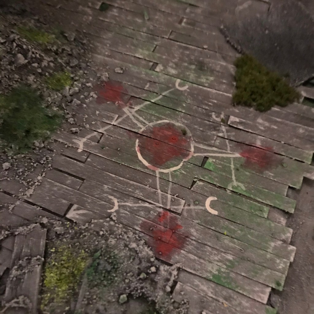 So I won’t bore you with all the details. Prime it black, spray grey from above, basically base coat it, make wood and dirt brown, outer walls were mostly left grey, I did some interiors in a light blue, green or dark red. Then the entire thing got a black wash and then a bone colour dry brush. I then applied different flocks and foliages to make everything look like it had been abandoned for some time. I also sponged some green paint on various areas to replicate moss. Here are a couple of pics from a recent test game: