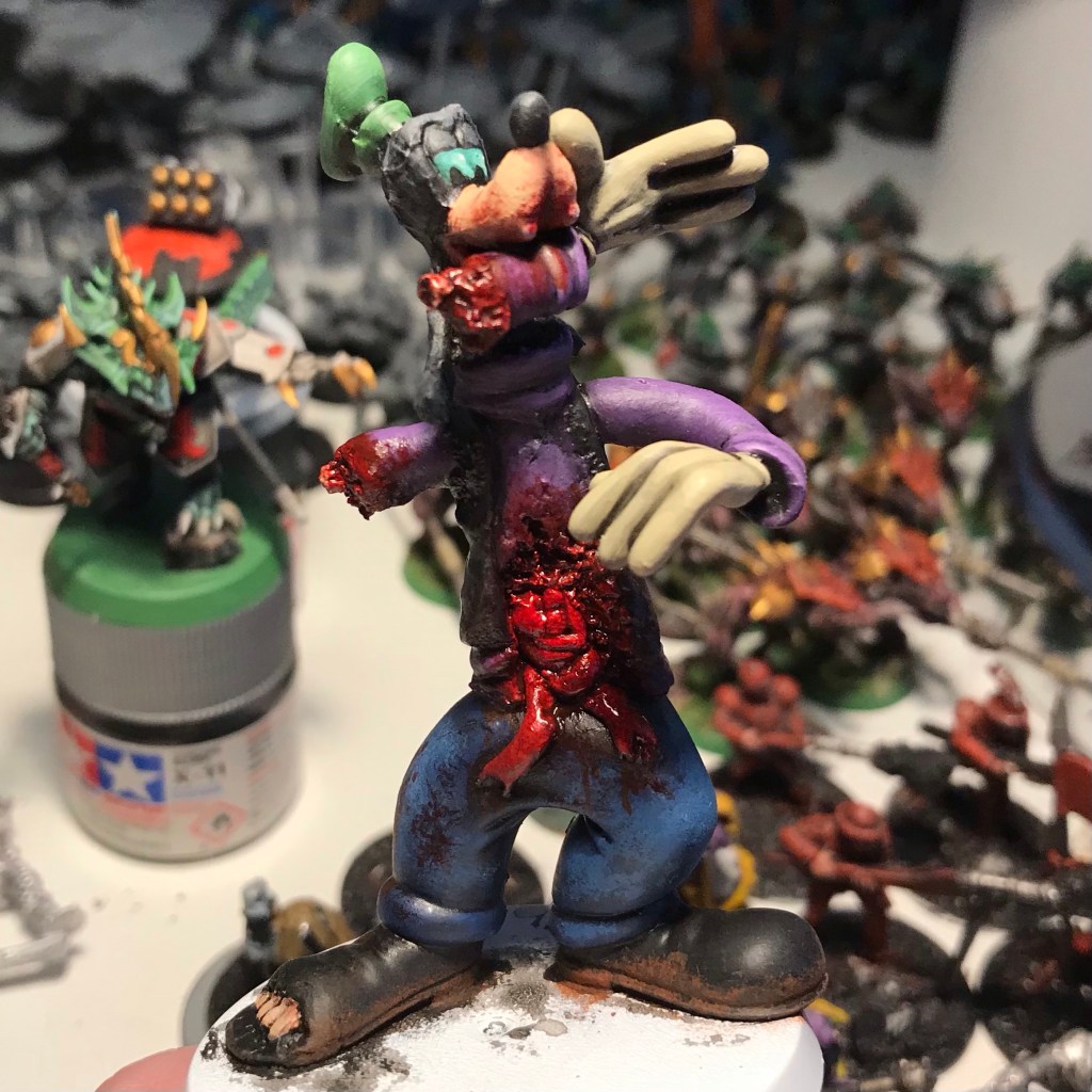 In the past week I set about zombifying Goofy. It was a fairly easy process, being a vinyl figure he was mostly hollow so cutting him up was easy enough. It’s mostly Miliput work. I’m particularly happy with his damaged shoe which I sculpted his toes in. His severed arm that he’s also decided to chew on involved miliput and a cocktail stick for that sticking out bone.