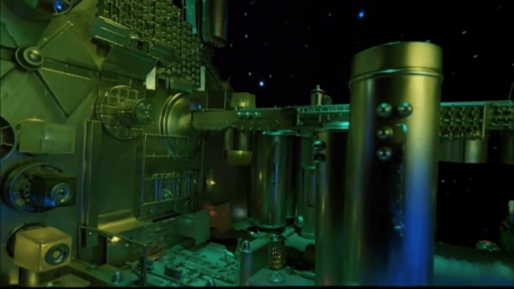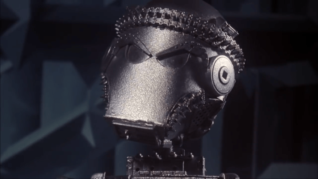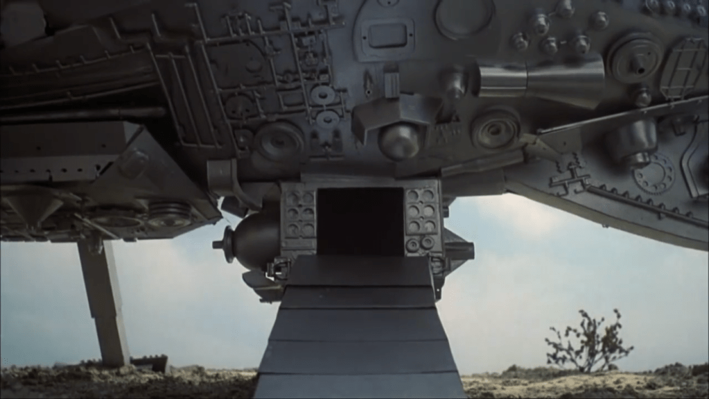 It’s common within sci-fi film making when building spaceships to buy a few model kits and glue random parts of tanks and planes to your model for additional detail. It’s just that your supposed to hide or transform the parts into something new. In Starcrash however they don’t. The tank track headbands of the stop motion Golems are one of my favourite details:
