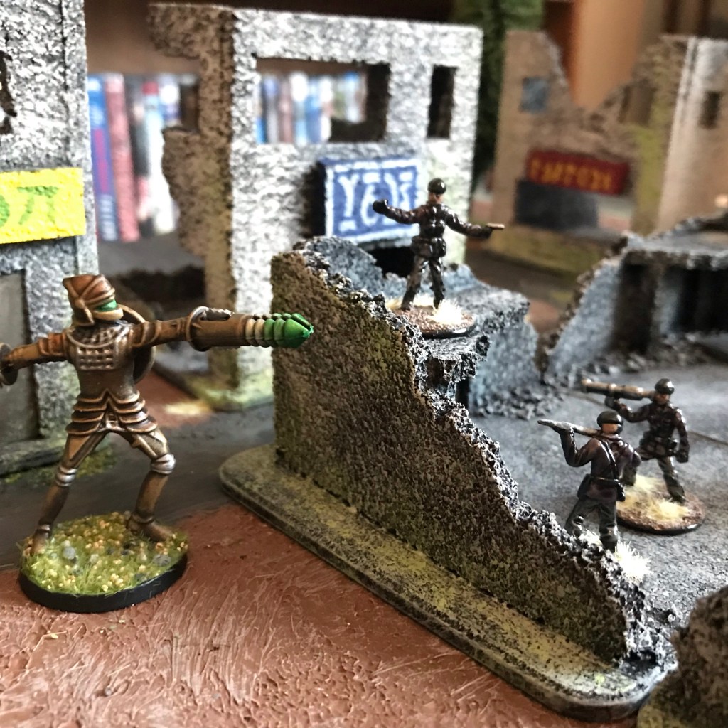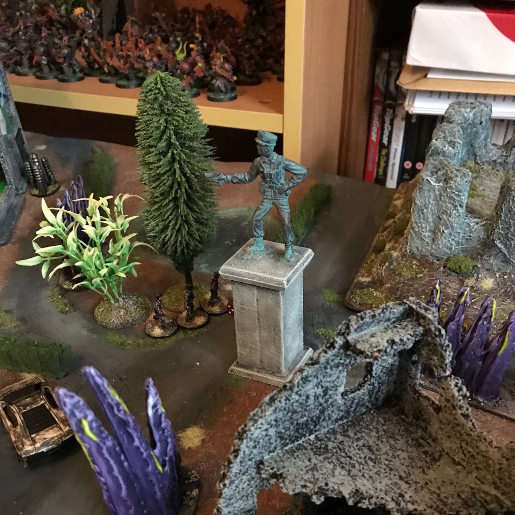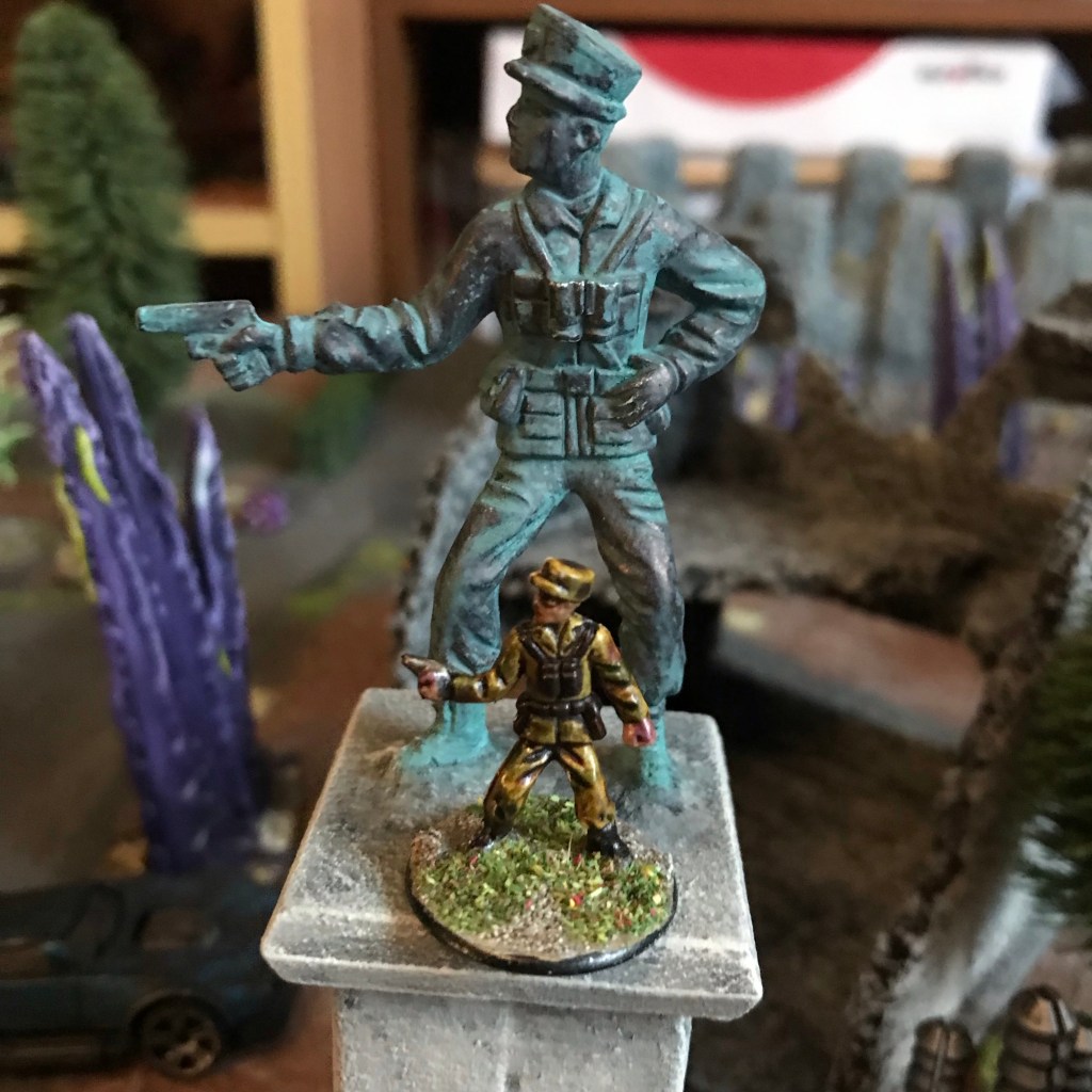 Another thing that was taking up space on my desk was a heroes monument that I was hoping would make a good central objective for my forces to fight over. He’s just one of the larger figures glued to a stack of wooden blocks and different sized bases: