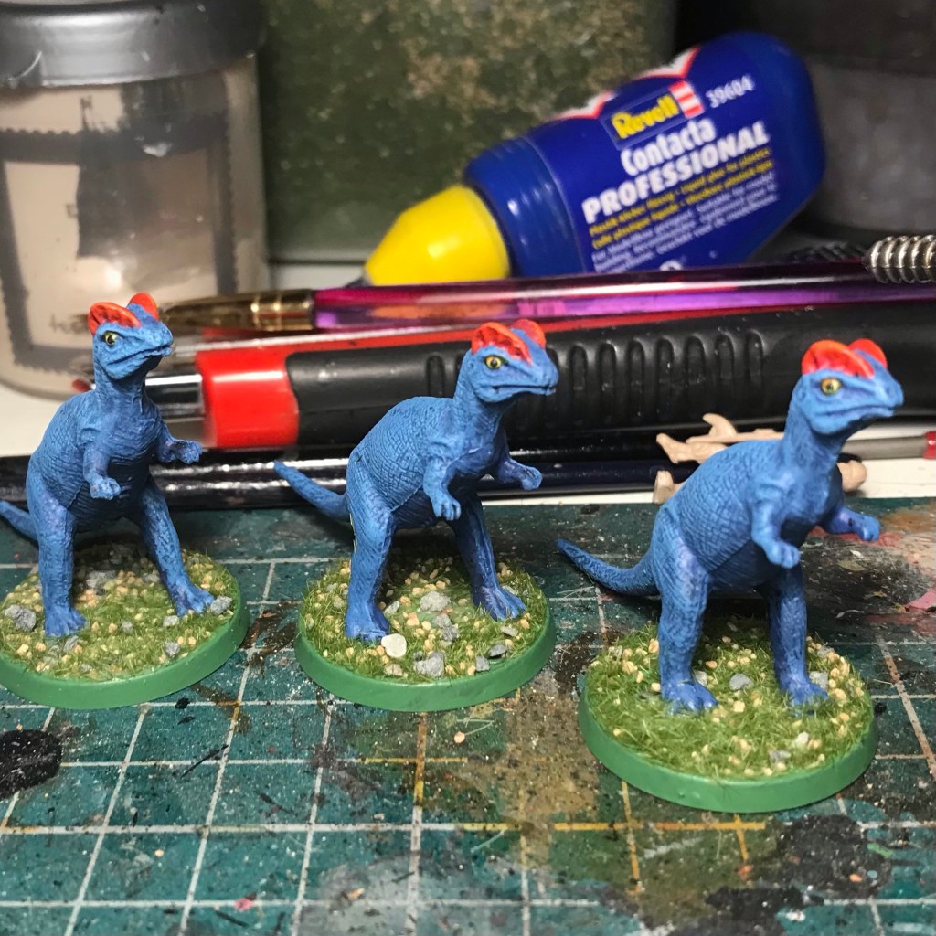 So I thought it would be a good idea to add some again, and here they are three Dilophosaurus. These guys are of a more rubbery plastic which goes sticky after a while if you use a normal spray primer so it is important when you paint them to instead brush prime with a 50/50 mix of pva glue and paint.