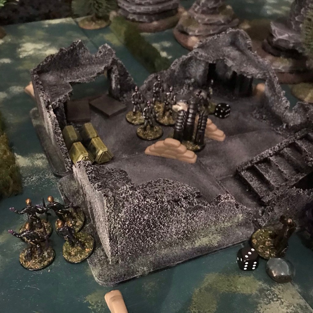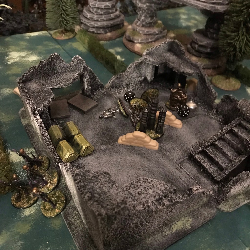 The smaller Cultist unit moves into the fort to claim the objective. Then the Splicer jumps into the fort too. He fires at the Invaders directly ahead with his Gene Ripper (3H3). He scores three hits, beats the shields twice for a total of 6 damage. The Invaders have a toughness of 2 and so have to make three saves. They pass all and so no casualties are scored. The Invaders return fire and put 2 damage on the Splicer.