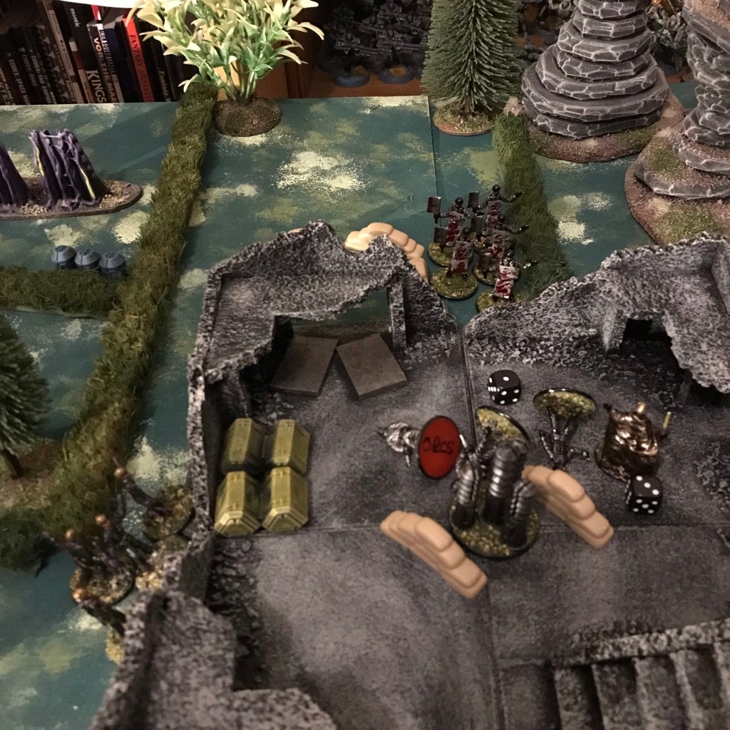 The red Queen appears. The Invaders unit on the left activate their objective scoring two points. They then open fire on the Cultist unit near by, they score three hits including the Destroyer. All then also beat the shields for a total of 8 damage (including the 1 remaining from before). The Cultists are forced to make 4 hard cover saves of 4+, they fail three leaving only the Cultist with the Repeater standing. He fails his morale check and is pinned, and so cannot return fire. Mortan’s lead is shrinking 8-5.