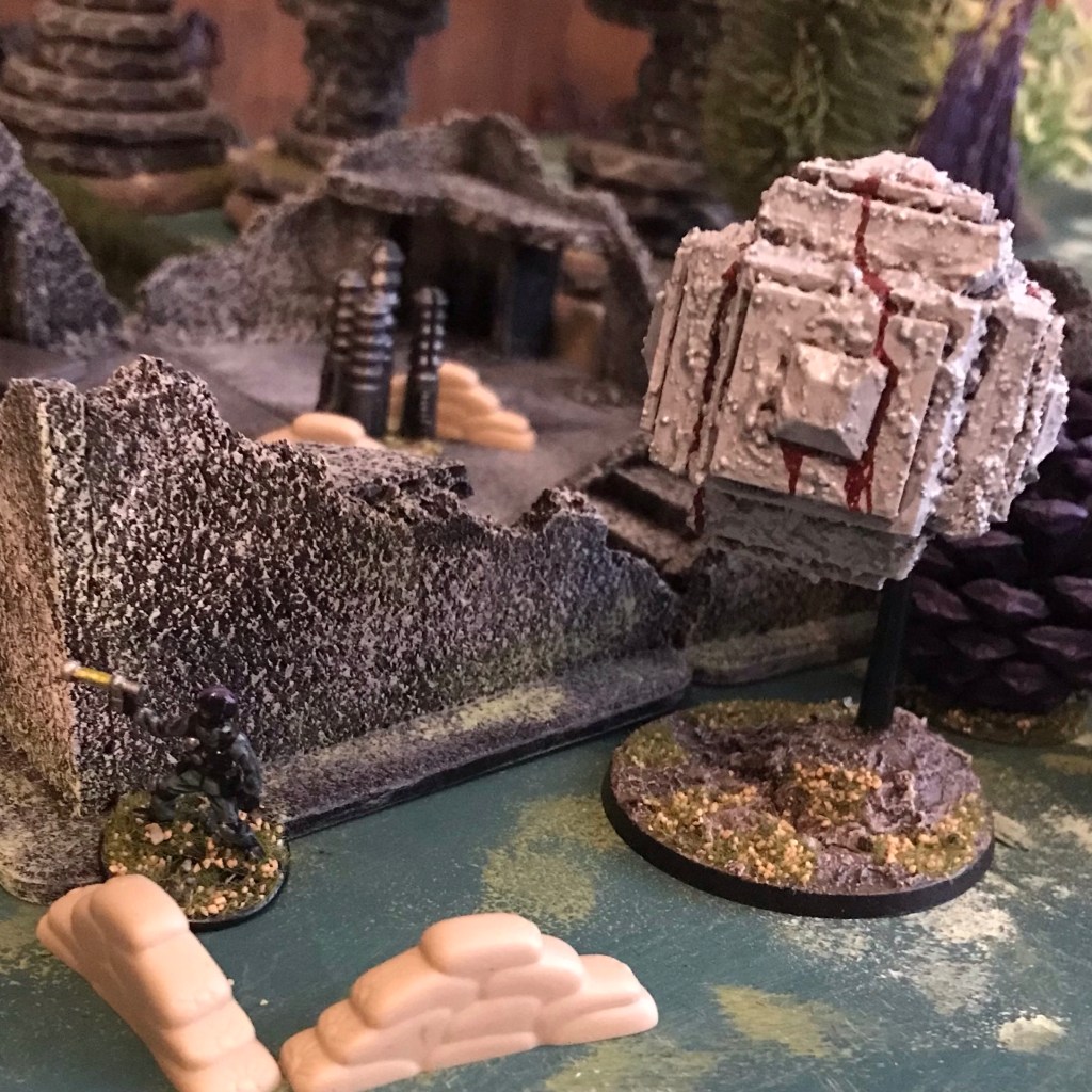The Ascended then aimed and fired at the Ghosts getting him +1 to hit. 6 hits were scored and 3 beat the Ghosts shields causing them to make a saving throw which they failed so a Ghost went down. The Ghosts returned fire and managed 3 more damage forcing a saving throw which the Ascended luckily passed.