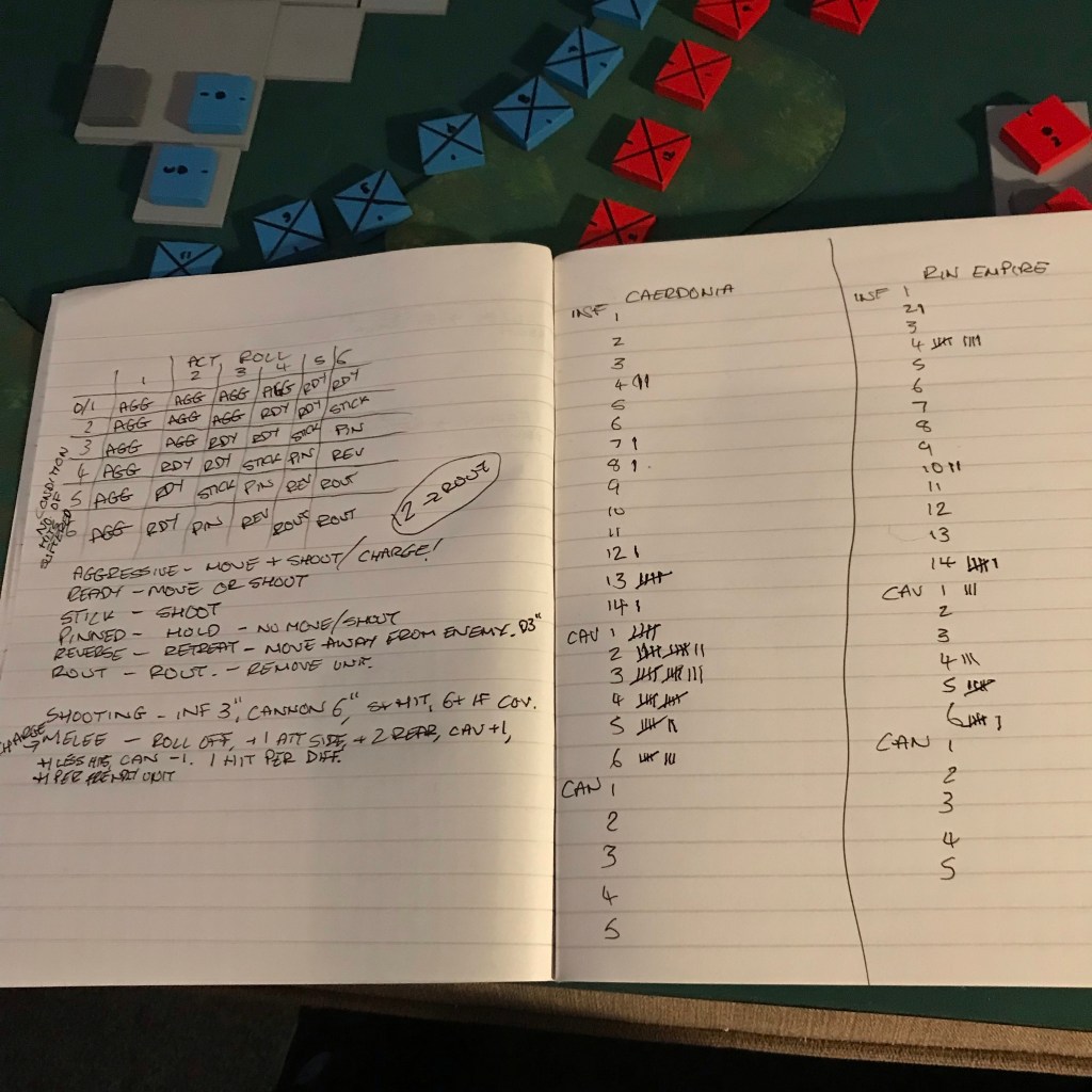 So you don’t have the board cluttered up with dice and counters I recommend keeping track of hits on a sheet of paper. Each unit is not only designated infantry, cavalry or cannons but also numbered to make this easy.