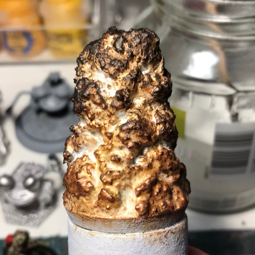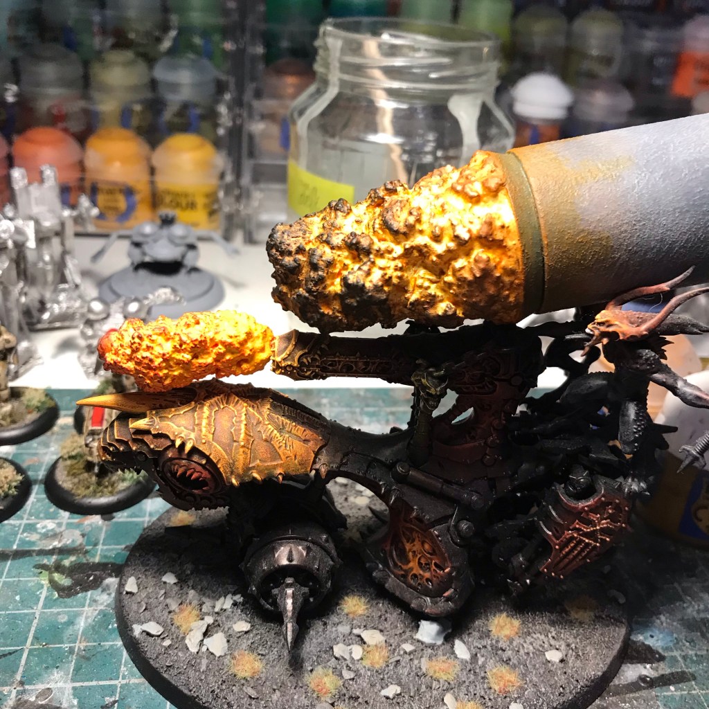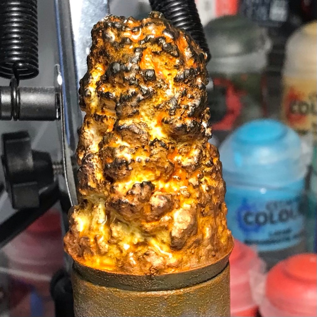 I thought about why metallic fire might be more effective that your standard orange stuff and it might be to do with light. Fire generates light and paint can’t, but metallic paint is reflective and so helps with the illusion that the fire is generating light.