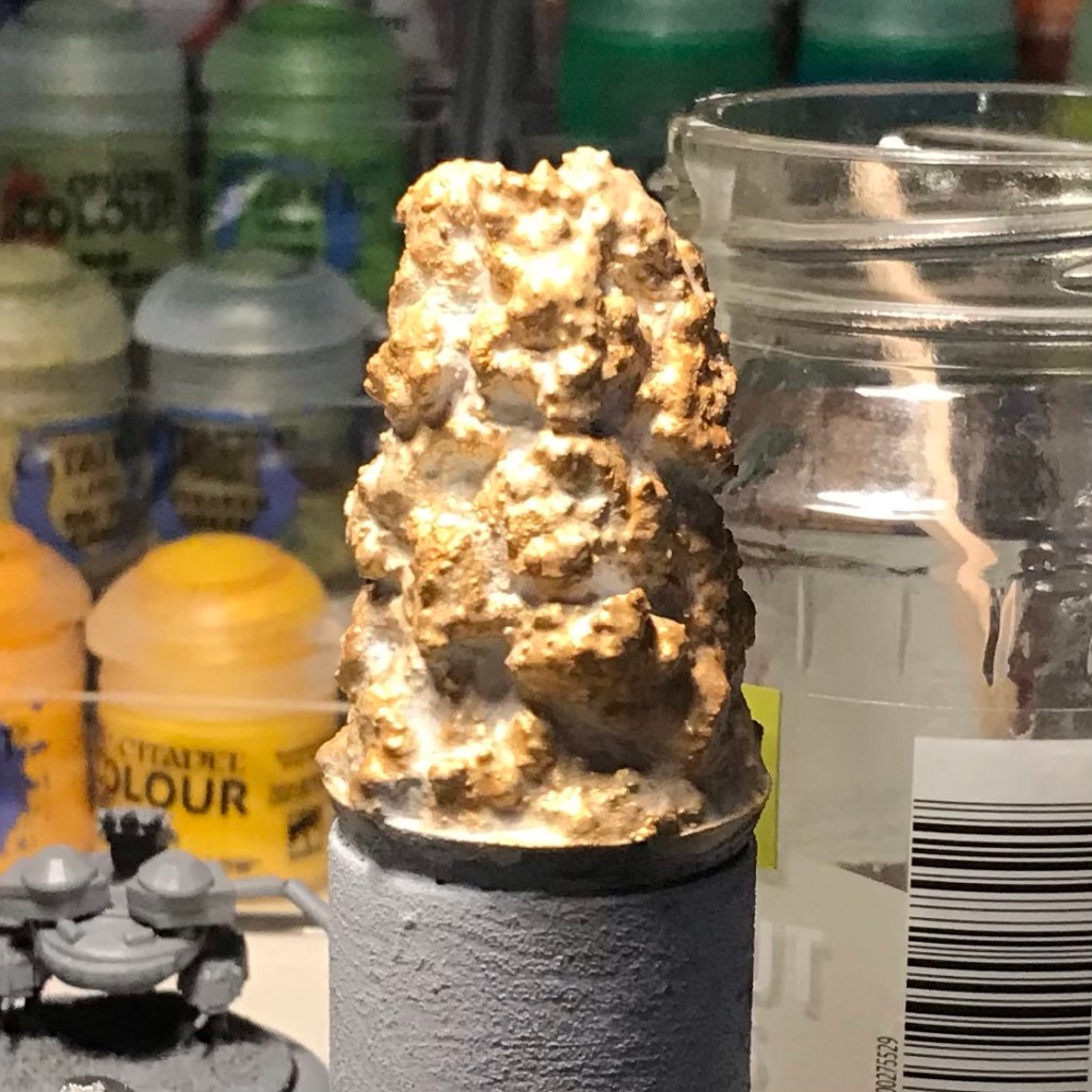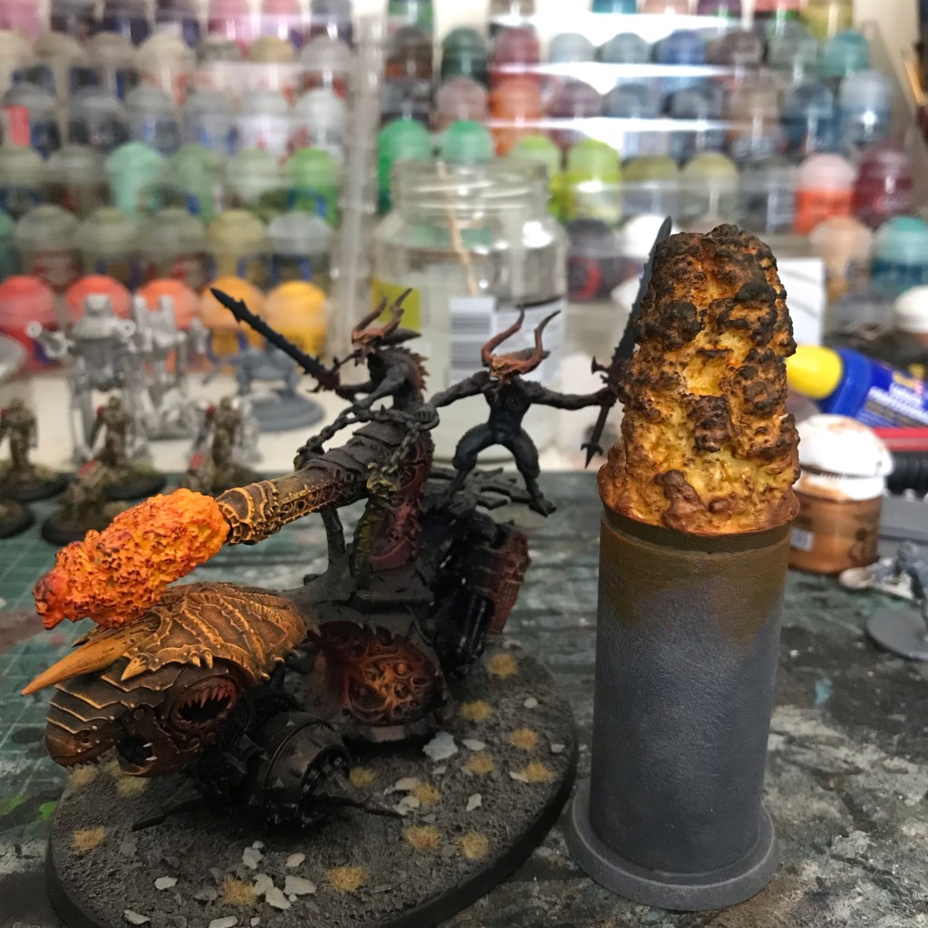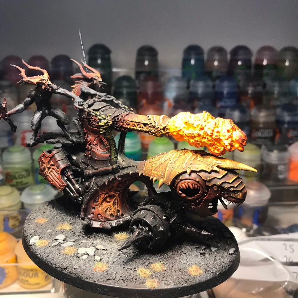 I thought about why metallic fire might be more effective that your standard orange stuff and it might be to do with light. Fire generates light and paint can’t, but metallic paint is reflective and so helps with the illusion that the fire is generating light.