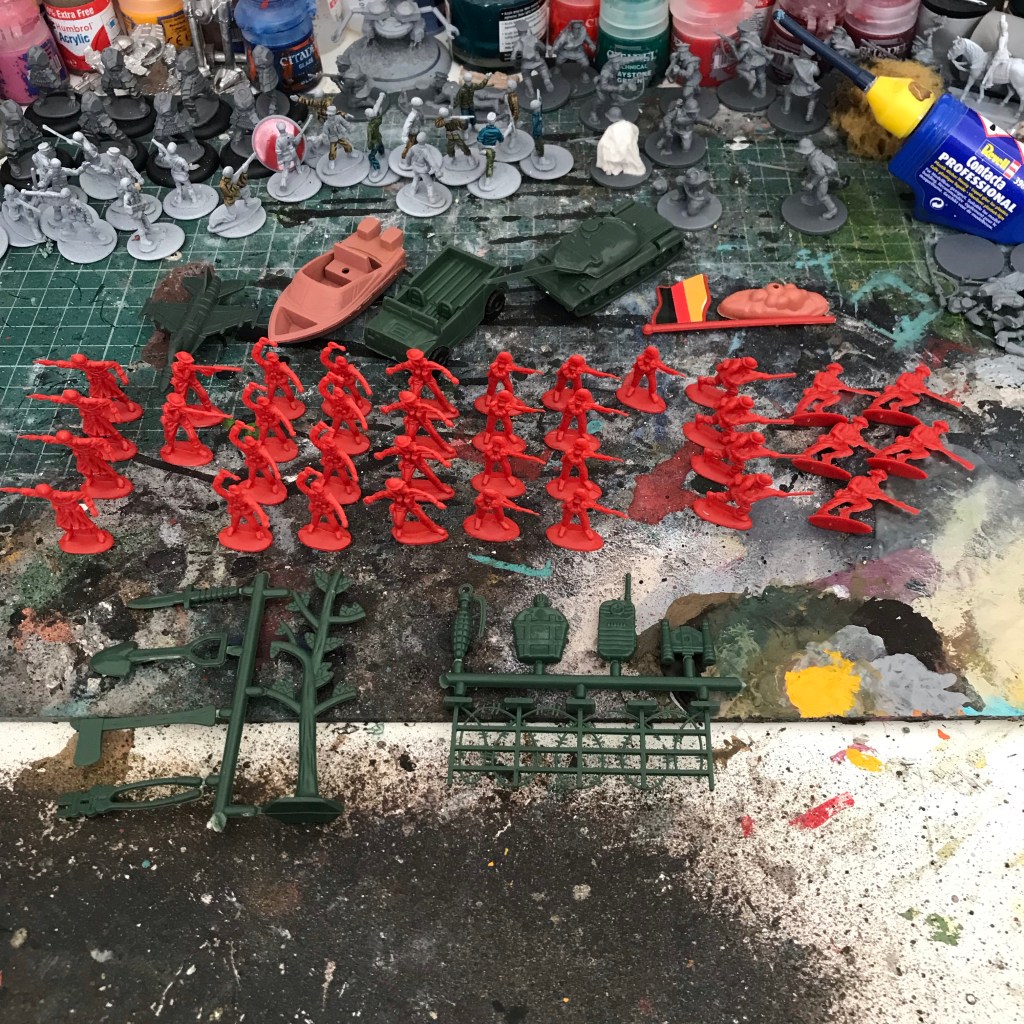 Each box contained 36 figures (in 8 possible poses), a flag (always German for some reason), some accessories all extremely oversized other than a potentially useful tree and 4 vehicles.