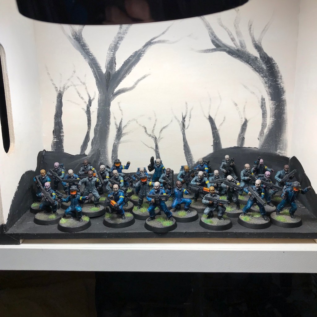 Unfortunately I forgot to take any real in progress pictures of these figures, but needless to say these guys were ‘slapchopped’. Slapchopping if you’re unaware is where you prime a figure black, drybrush it white to highlight all the details and then applying a paint like Citadel’s Contrast line to add all the colour in. It’s a very fast and powerful technique, that allowed me to paint 30 figures in a matter of days. The only additional step I took was to highlight their bald heads as the wash-like nature of Contrast paint made a mess of the flat surface of their heads. All I had to do to highlight was mix a little of my chosen Contrast colour with white paint.