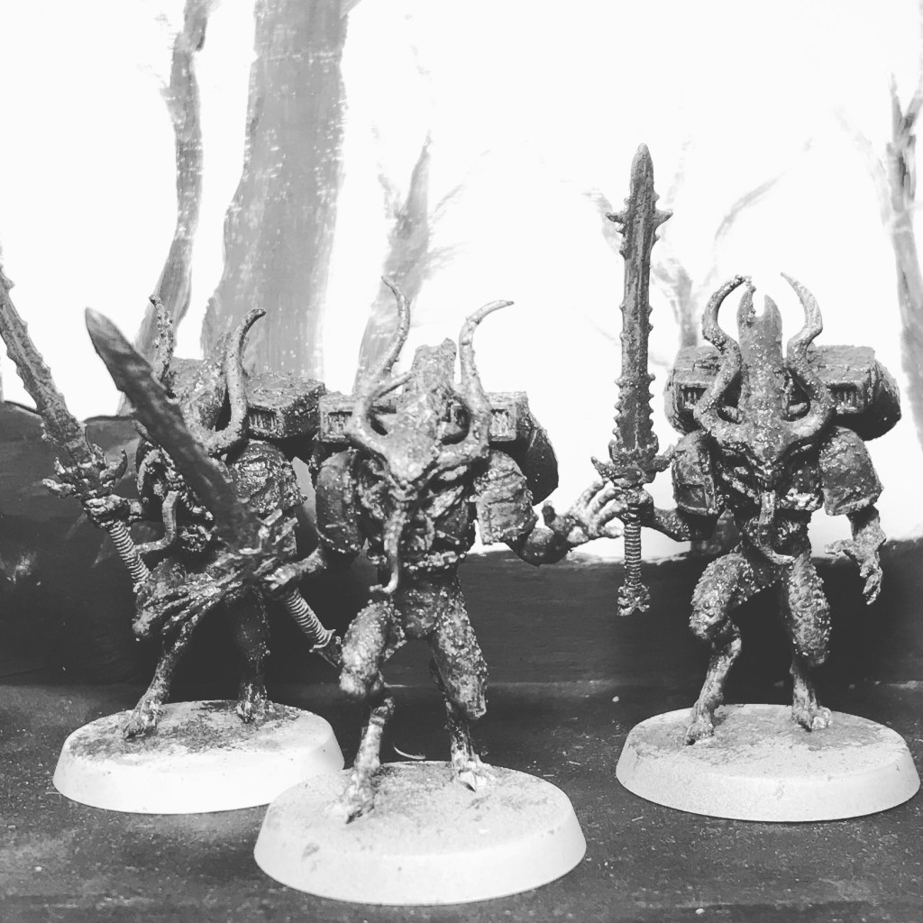 This last week I’ve actually added two new units – 10 possessed and 6 bikers. The possessed are a kitbash using an old box of Bloodletters I had lying around and a box of old Khorne Berserkers, with regular marine jump packs since possessed can take wings in Grimdark Future as an upgrade: