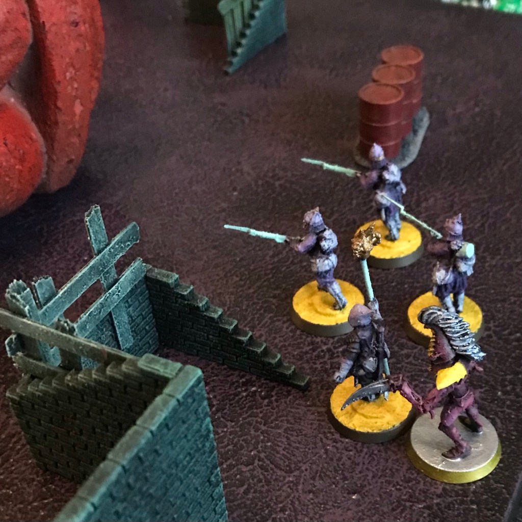 Without explaining too much of the rules, they are based on my own Simple Toy Soldier system, using polygonal dice to determine the number of actions a figure has on a given turn, based on five skill levels – Roaches that use a D4, Rabble D6, Regular D8, Blooded D10 and Chosen D12, straightforward enough.