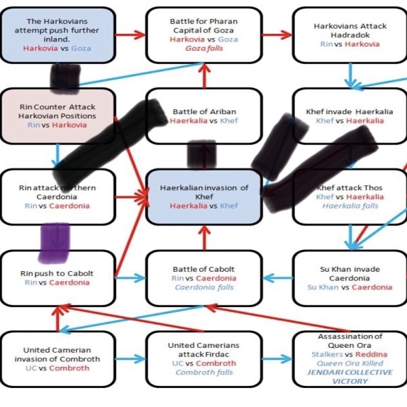 Ha no problemo, I can’t actually remember if I said that anywhere, other than in my original Oltra Campaign. Red is for House Baronor, Blue is for the Jendari Collective. House Baronor win I follow the Red Arrow, the Collective I follow the Blue. Hope that helps.
