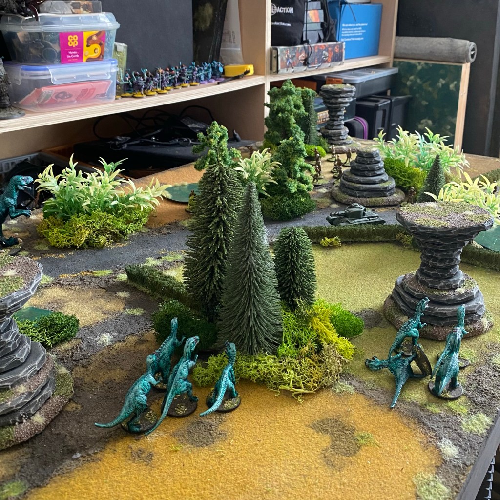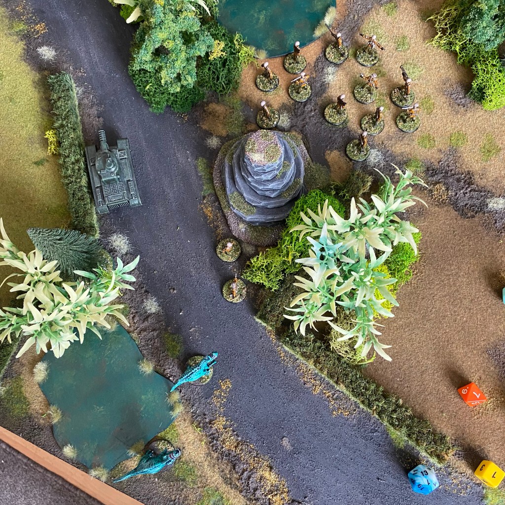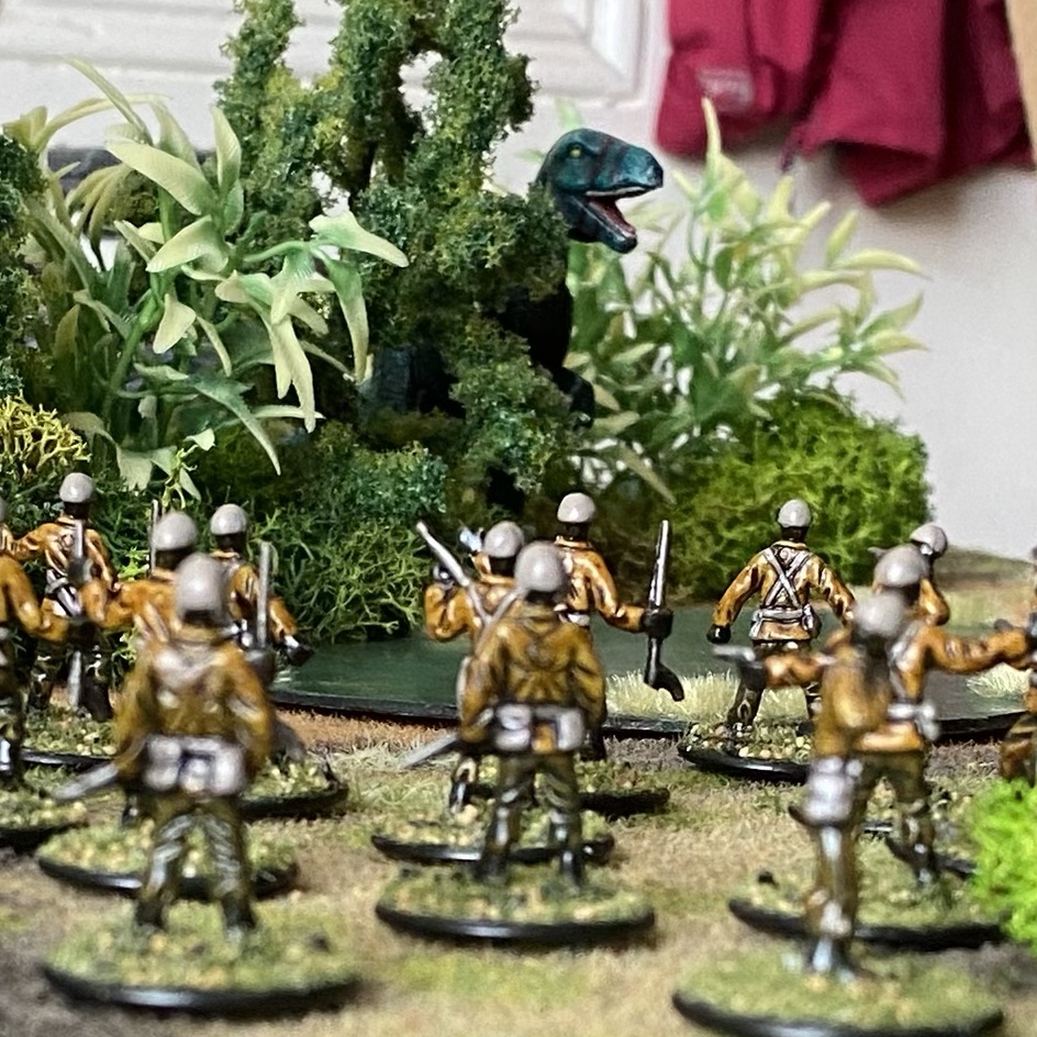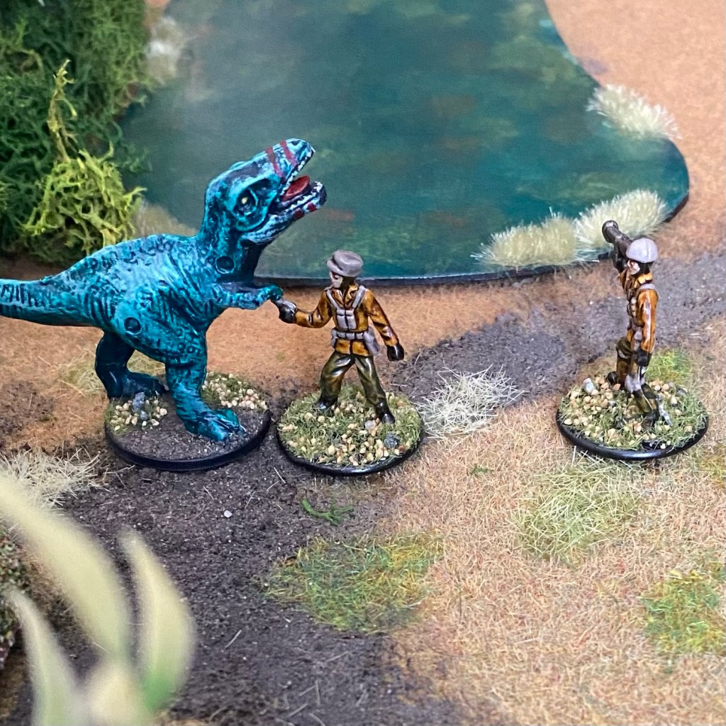 The Dinosaurs in this battle are going to be classed as Elite (D12) Beasts with Very Heavy Armour (D12) and Grenades (they can spit acid), and the big one is a Hero (D20) Monster with Super Armour (D20) and Grenades.