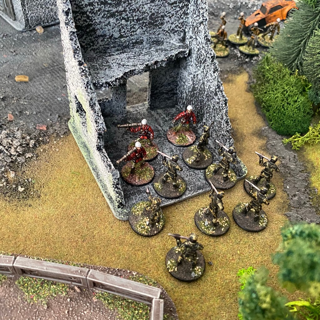 Firing destroyers or throwing grenades at buildings: 2+ to hit the building, 6” range maximum for grenades (you need to be closer to accurately lob a grenade through a window etc). All enemies inside the building then make saving throws (4+). For larger buildings divide them up into sections, only hitting all figures within a section.