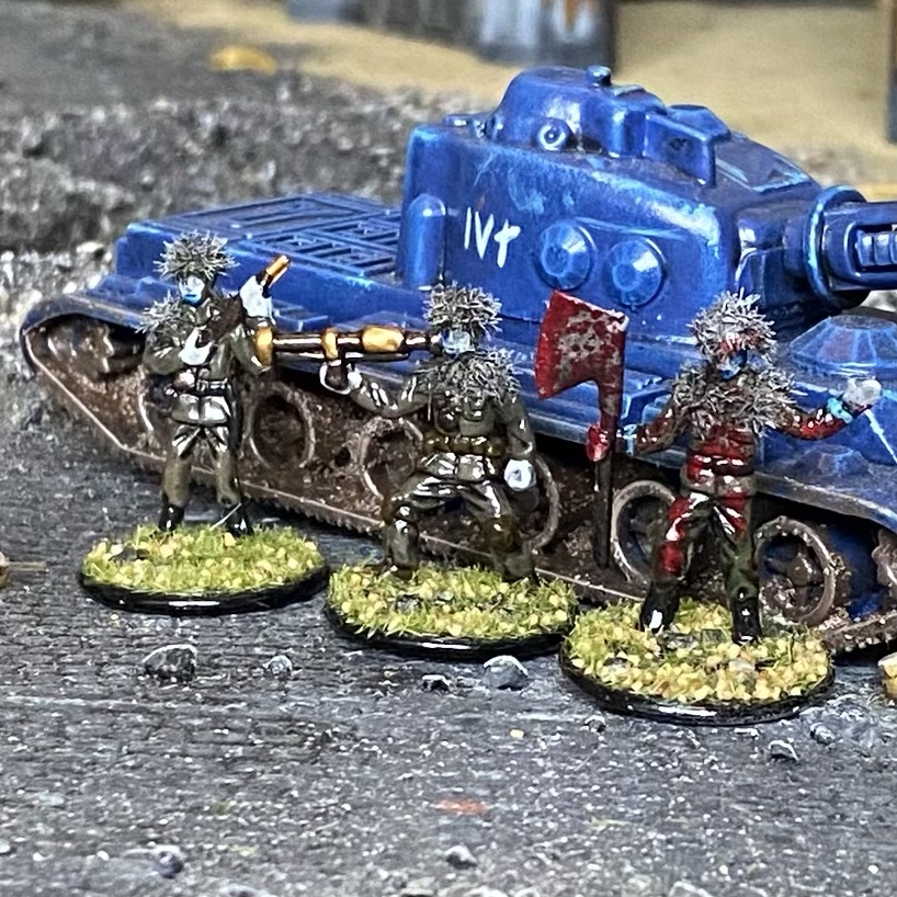 The Striig are the most brutal and violent of the Solar Raider tribes, they are mostly seen wearing browns and dark greens often with foliage weaved into their helmets and jackets for additional camouflage. The Striig also wear blue and white war paint. A Striig warband is led by a Strake who carries a large laser edged battle axe capable of passing through energy shields and armour.