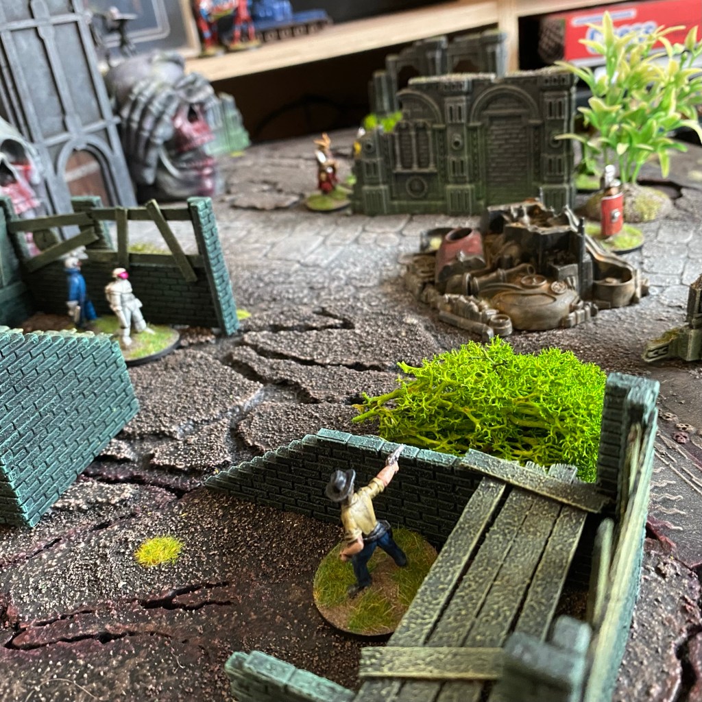 The game in the pictures on this post had a fairly basic set up, however with the road across the middle of the board I’d created a no man’s land. Naturally this lead to figures taking cover and taking pot shots at each other, trying to grind down the other side, while the melee focused characters waited for their opportunity to cross. It wasn’t the most exciting or dynamic game (but having said that I am always excited when one of my rulesets does mimic something of actual combat).