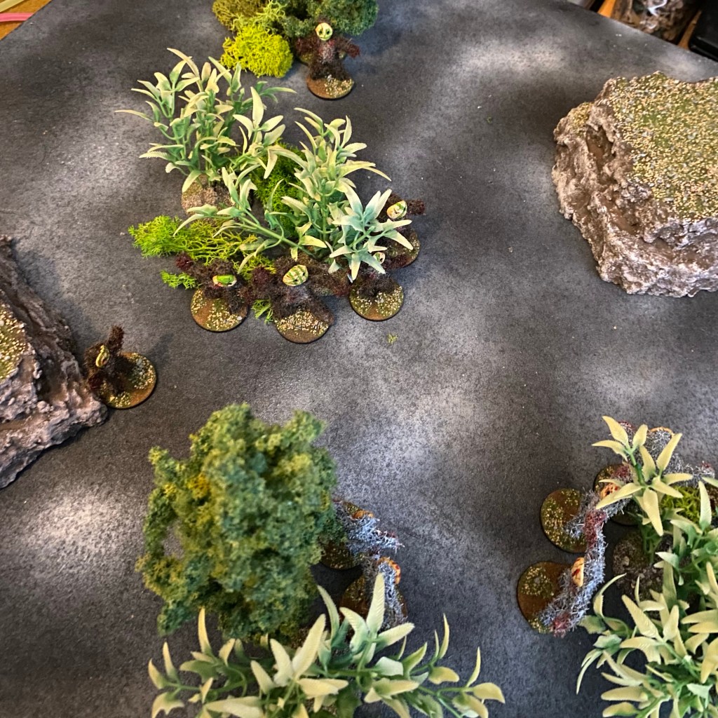 I really liked this idea in principle, however in practice you’re hampered by having multiple different terrain types available. It’s not an issue for most games, but my whole ethos with WOTH is to have minimal barriers to entry. So as a variation on the idea above, I had 6 pieces of terrain, and in turn players would randomly roll for which they put a figure in or in contact with. Rerolling anytime a piece is selected that has an enemy already in/on it.