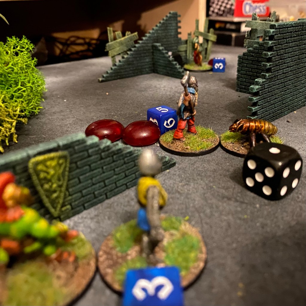 I’ve been working on another stat ‘Presence’, which is a bit of an odd one so far, but add a little more flavour and diversity to my figures which as odd and varied as they are can only be a good thing. Presence allows figures to make special ranged attacks against enemies within 6”, again by rolling above you hit, you also save against those attacks using the target’s Presence stat, again by rolling above. So a low Presence is good for those attacks. However, I’ve also thrown in objectives, points on the board for figures to attack and defend (as much as I don’t like ‘objectives’ done in this way), and at the end of the game you total up your figures’ Presence on each objective to see who’s holding it. So for objectives and in that case winning the game, a high presence is good.