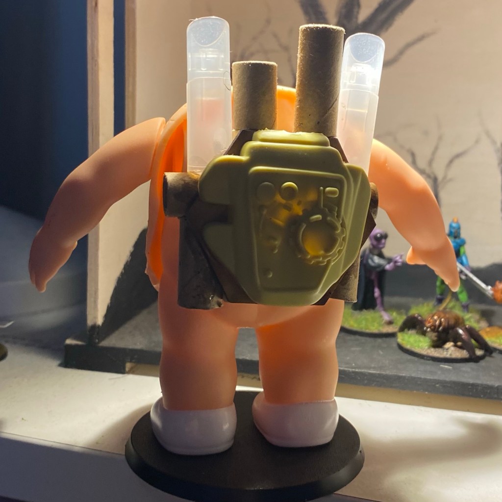 Starting with the back, utilising some spare MDF bases, wooden cubes, felt tip pen lids, dog poo bag cardboard tubes, and the turret of a toy tank, I built out the Dread’s ‘engine’.