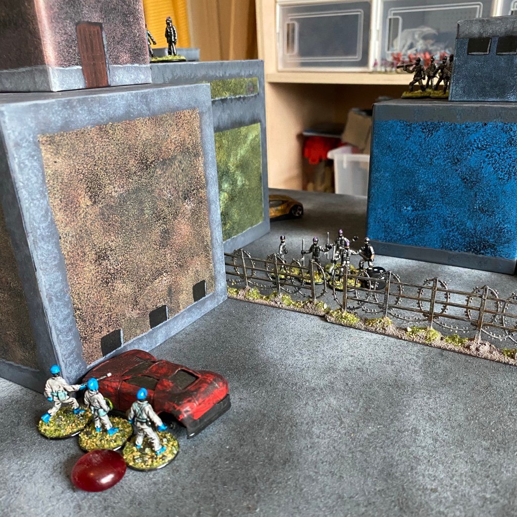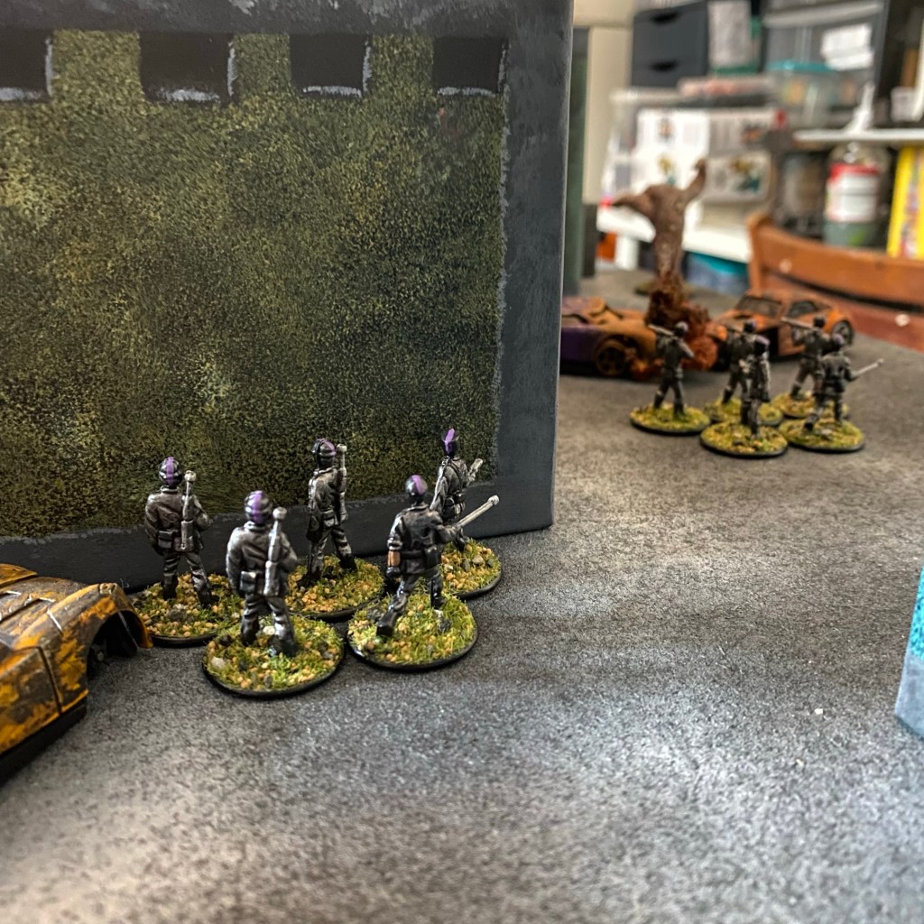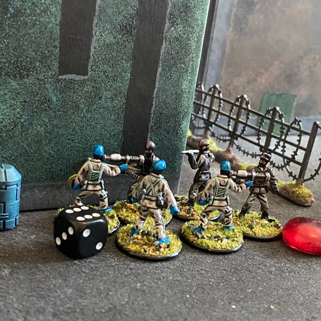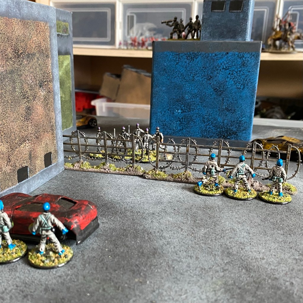 The game is played on a 2’x4’ board and the figures used are 1/72 or 20mm. The board should be fairly dense with terrain, with a mix of soft and hard cover.