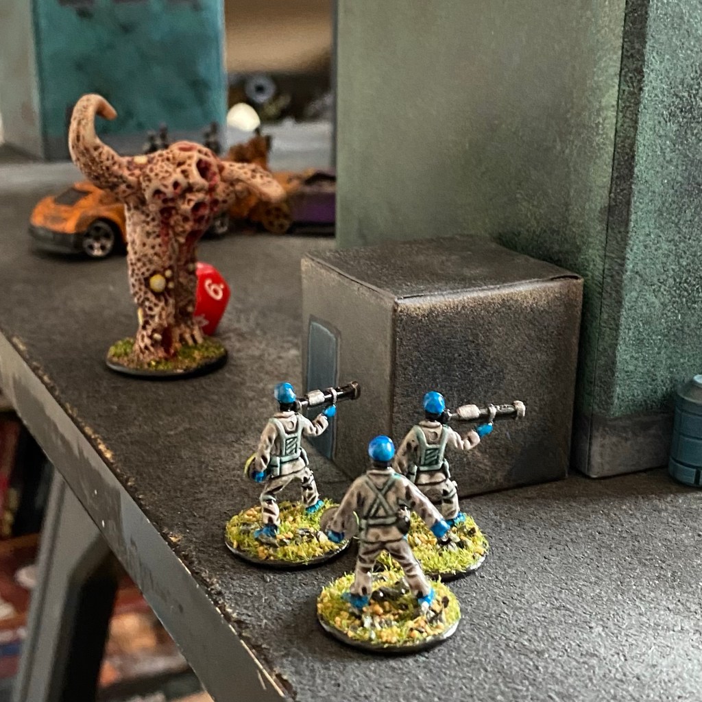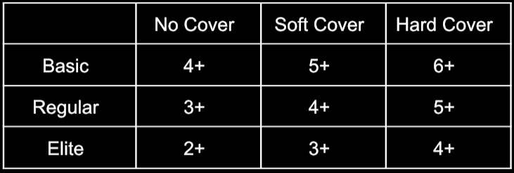 Roll a die for each shot to see if you hit the target depending your squad’s skill level and upon their target’s cover: