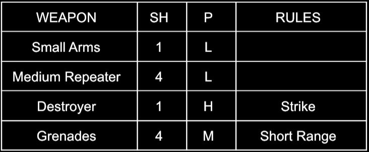 Here is an example weapon’s table so you get the idea, a force’s specific weapons table may vary: