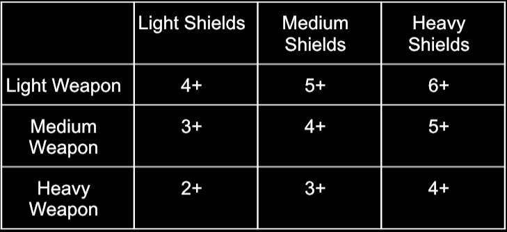 Each hit scored is rolled again against the target’s shields, this time comparing the Power (P) of the weapon against the Shield Strength (SS) of the target squad: