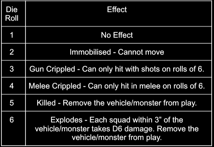 When a vehicle or monster is reduced to 0 shields and then fails a saving throw instead of being removed from the table like a normal figure you roll on the damage table below to see the effect of the hit: